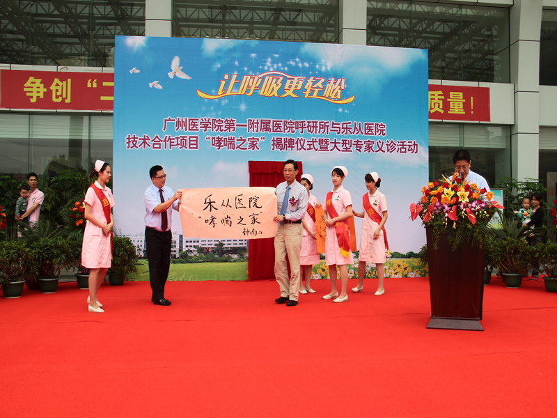 在揭牌儀式上,鐘南山院士贈送樂從醫(yī)院親筆題字二幅:樂從醫(yī)院“哮喘之家”、揚(yáng)帆奮進(jìn) 爭創(chuàng)“二甲”,鼓勵樂從醫(yī)院向更高更遠(yuǎn)的目標(biāo)前進(jìn),將“哮喘之家”越辦越好,為更多的哮喘患者提供規(guī)范治療和預(yù)防服務(wù)。隨后鐘南山院士、區(qū)政協(xié)副主席區(qū)衛(wèi)計局常務(wù)副局長劉明、樂從鎮(zhèn)副書記謝順輝、樂從鎮(zhèn)黨委委員、衛(wèi)計局局長陳杰民、樂從鎮(zhèn)衛(wèi)計局常務(wù)副局長崔兆林、樂從醫(yī)院院長曾益民共同為樂從醫(yī)院“哮喘之家”揭牌。