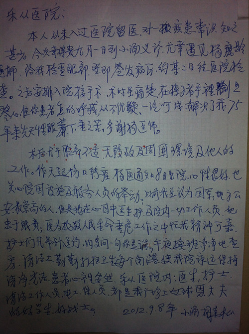 “樂從醫(yī)院所有的醫(yī)生、護(hù)士都是我們白求恩大夫的好學(xué)生、好戰(zhàn)士……” 9月8日,五官科住院部收到了病人胡叔給醫(yī)護(hù)人員的感謝信。