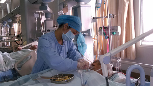救死扶傷、兢兢業(yè)業(yè)。記得2012年12月,急診科接送到一位急性心肌梗死的病人,送到ICU時(shí)已經(jīng)心跳呼吸驟停,從同事手中接過病人,她就忙著心臟按壓、氣管插管、上呼吸機(jī)、心電監(jiān)護(hù)……,腎上腺素1mg靜推,5%SB60ml靜推,阿托品1mg靜推……,恢復(fù)了心跳,血壓60/28mmHg,多巴胺160mg微泵注入,熟練的搶救配合,精煉的護(hù)理技術(shù)讓這位危重患者的病情很快穩(wěn)定了下來;當(dāng)然除了每天緊張、急湊的搶救工作之外,面對(duì)一個(gè)個(gè)在死亡線上掙扎的危重患者,需要我們更細(xì)致的照顧和更嚴(yán)密的觀察,從每天早上床上擦浴、一口口給患者喂食、指導(dǎo)患者進(jìn)行肺功能鍛煉、協(xié)助患者肢體關(guān)節(jié)活動(dòng),她都身體力行,一絲不茍。她用瘦小的身體、辛勤的汗水讓一個(gè)又一個(gè)危重患者擺脫了死亡的威脅,重拾了嶄新的生命。