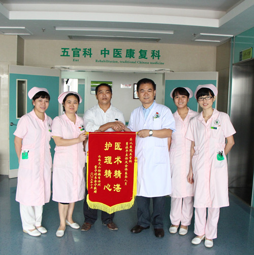 10月17日上午,一位身材魁梧、精神飽滿的中年男子手捧一面錦旗來到八樓五官科,仔細(xì)一看,原來是剛從五官科出院的韋先生。這次是專程來感謝五官科肖社平主任及科室全體醫(yī)務(wù)人員??匆娧矍斑@位精神抖擻神、神采奕奕的先生,您一定很難將他和手術(shù)前的模樣聯(lián)系在一起。