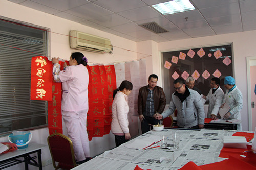 為營(yíng)造歡樂(lè)喜慶、祥和文明的節(jié)日氛圍,1月14日下午,樂(lè)從醫(yī)院在門(mén)診部三樓舉辦了“我們的節(jié)日• 春節(jié)——2014揮春送福”活動(dòng),佛山市書(shū)法家協(xié)會(huì)理事曾慶江先生、樂(lè)從鎮(zhèn)書(shū)法家勞浩勇先生及資深書(shū)法愛(ài)好家中醫(yī)康復(fù)科黎柱國(guó)主任現(xiàn)場(chǎng)即興揮毫,為員工寫(xiě)“福”字揮春和對(duì)聯(lián)。