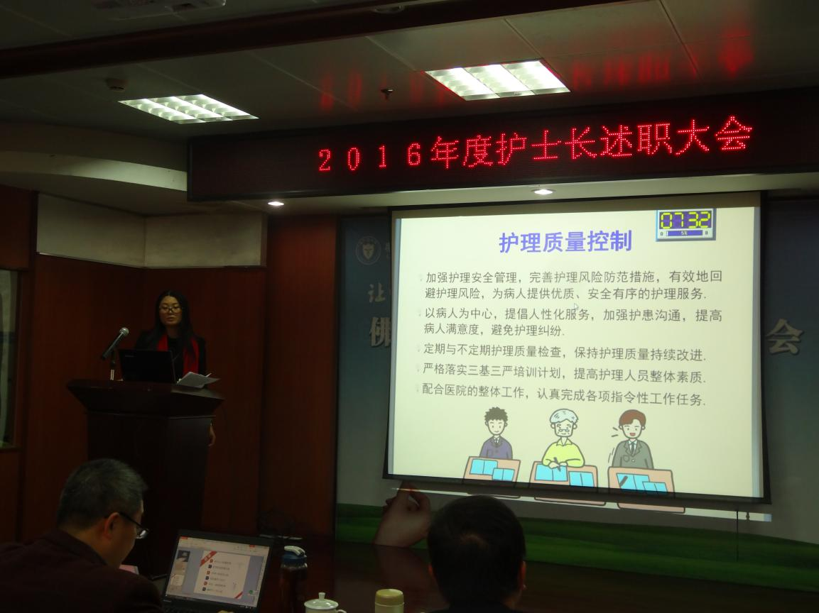 會議期間,護(hù)長們采用PPT的形式進(jìn)行述職,每人限時(shí)8分鐘。匯報(bào)內(nèi)容分為三個(gè)部分:對2016年度護(hù)理工作總結(jié)、科室的亮點(diǎn)和薄弱環(huán)節(jié)的分析改進(jìn)、2017護(hù)理工作計(jì)劃。本次匯報(bào)會由15名護(hù)士長、1名傷口造口??谱o(hù)士、1名血透室護(hù)理組長進(jìn)行述職。
