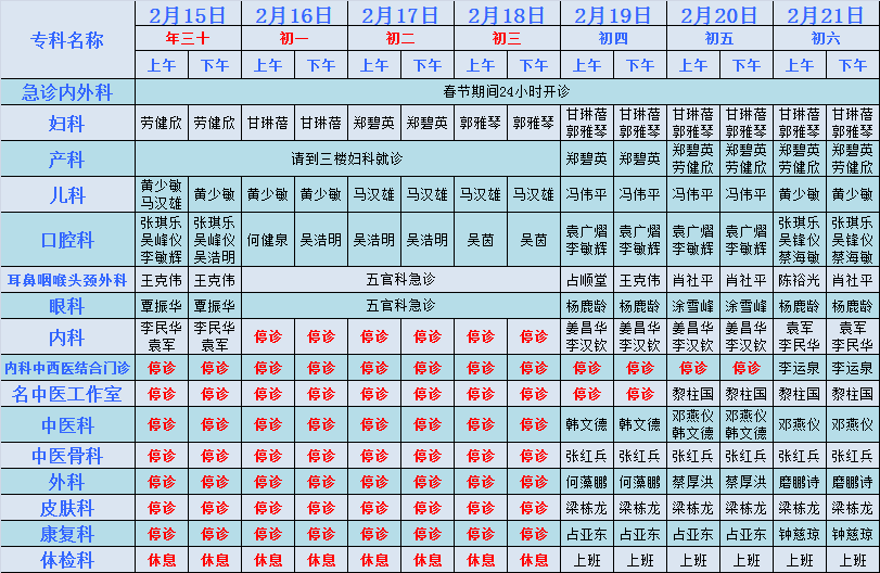 根據(jù)上級(jí)文件精神,結(jié)合我院實(shí)際,2018年春節(jié)放假時(shí)間為215日(除夕)至221日(年初六),共七天。放假期間出診安排如下: