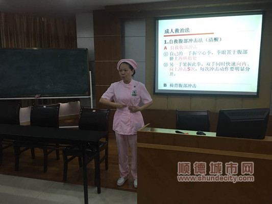 首場培訓心肺復(fù)蘇由該院門診護理總監(jiān)、護長曾秀芹擔任主講,她為同學們普及生命急救黃金8分鐘,并演示了心肺復(fù)蘇的基本操作步驟。