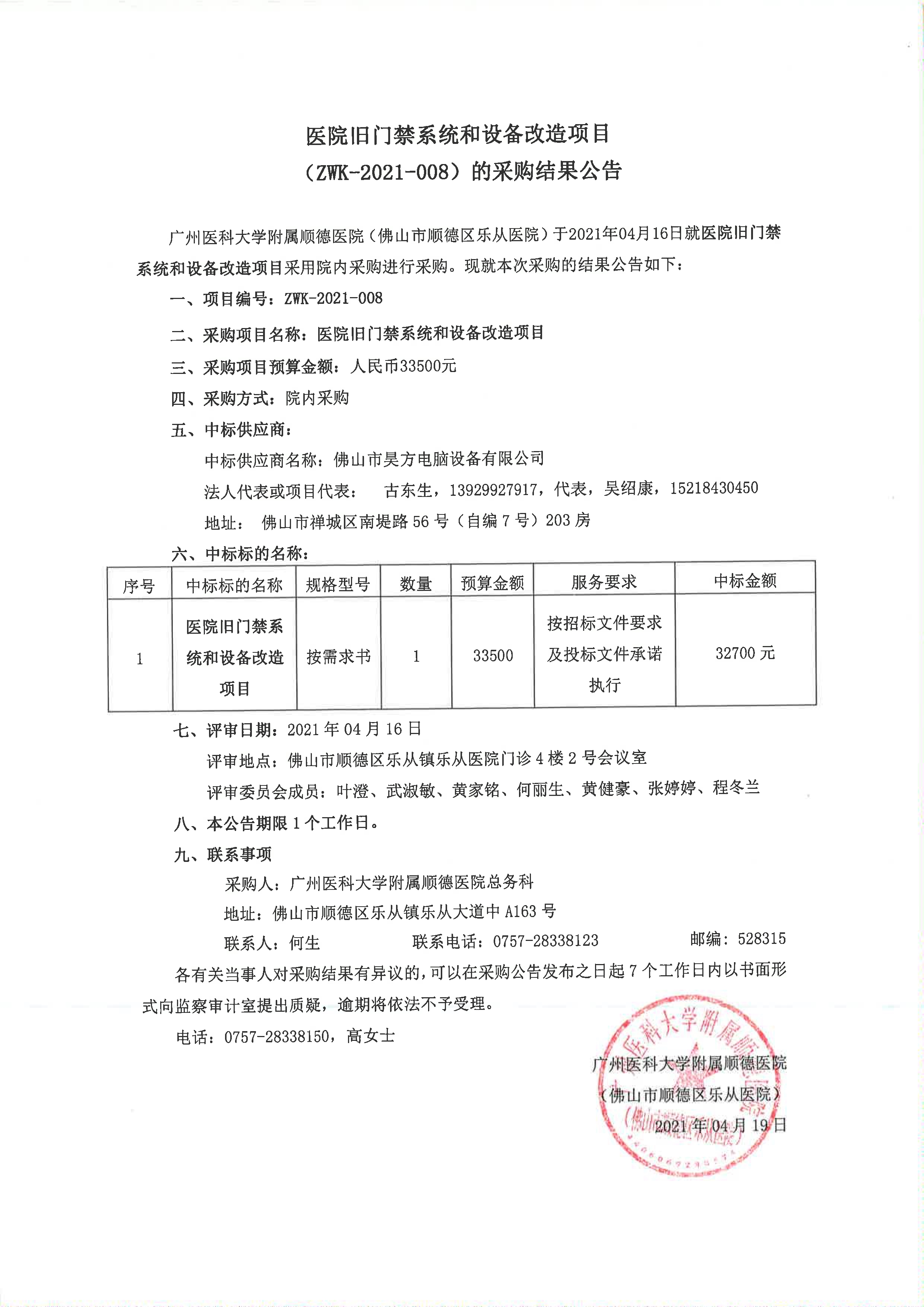 醫(yī)院舊門禁系統(tǒng)和設(shè)備改造項(xiàng)目(ZWK-2021-008)的采購結(jié)果公告