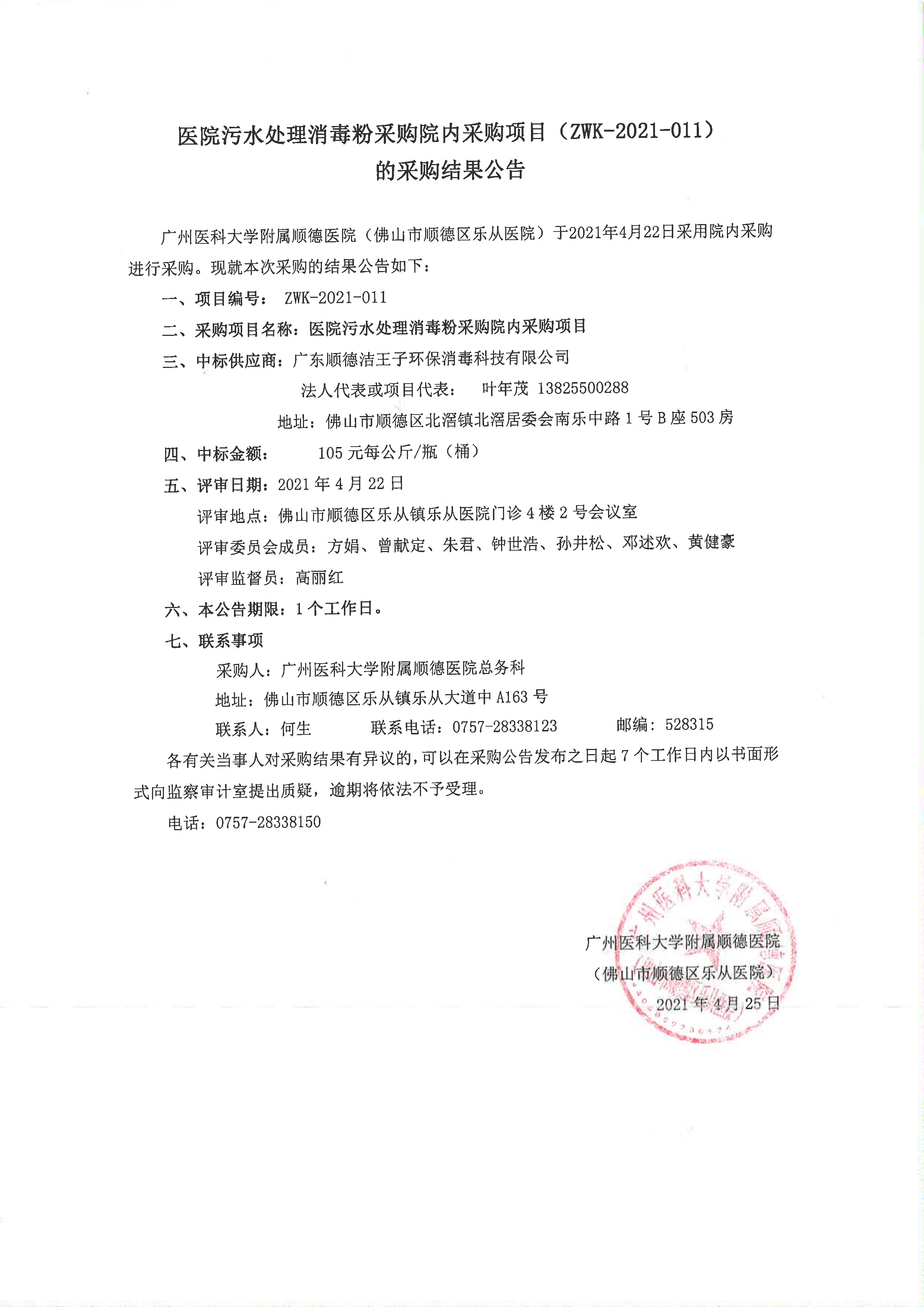 醫(yī)院污水處理消毒粉采購院內(nèi)采購項目(ZWK-2021-011)的采購結(jié)果公告