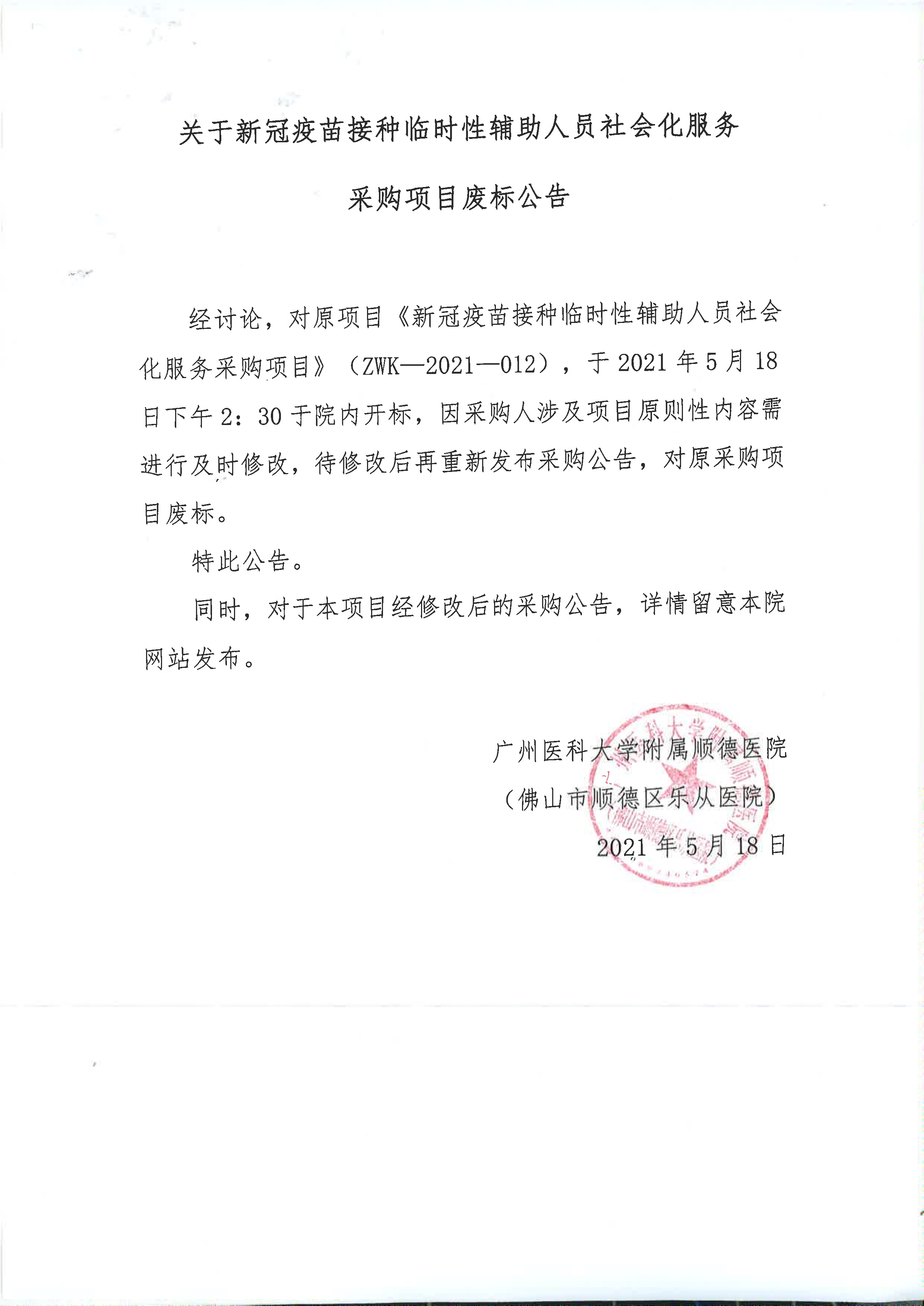 關(guān)于新冠疫苗接種臨時(shí)性輔助人員社會化服務(wù)采購項(xiàng)目廢標(biāo)公告