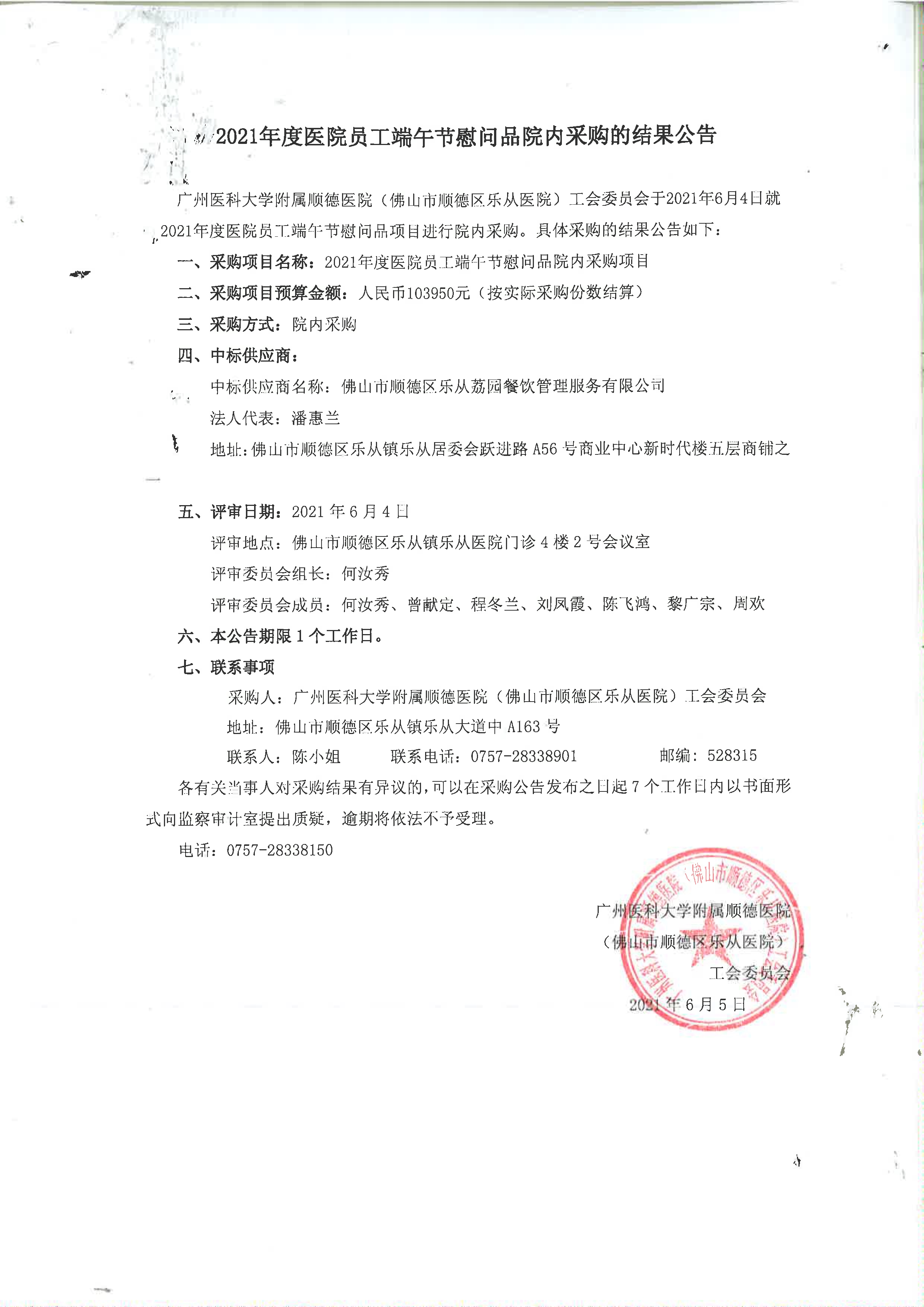2021年度員工端午節(jié)慰問品院內(nèi)采購(gòu)的結(jié)果公告