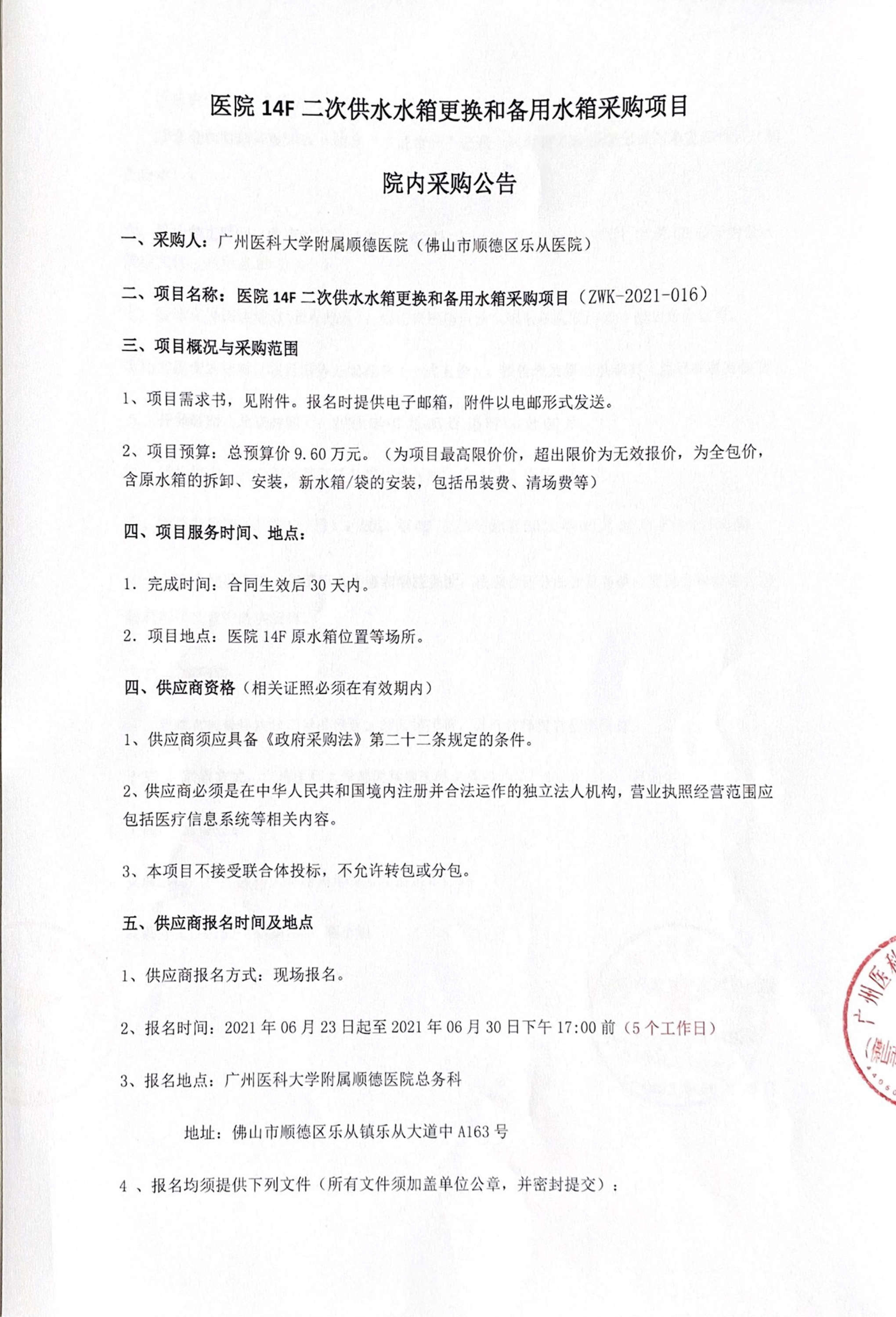 醫(yī)院14F二次供水水箱更換和備用水箱采購項(xiàng)目