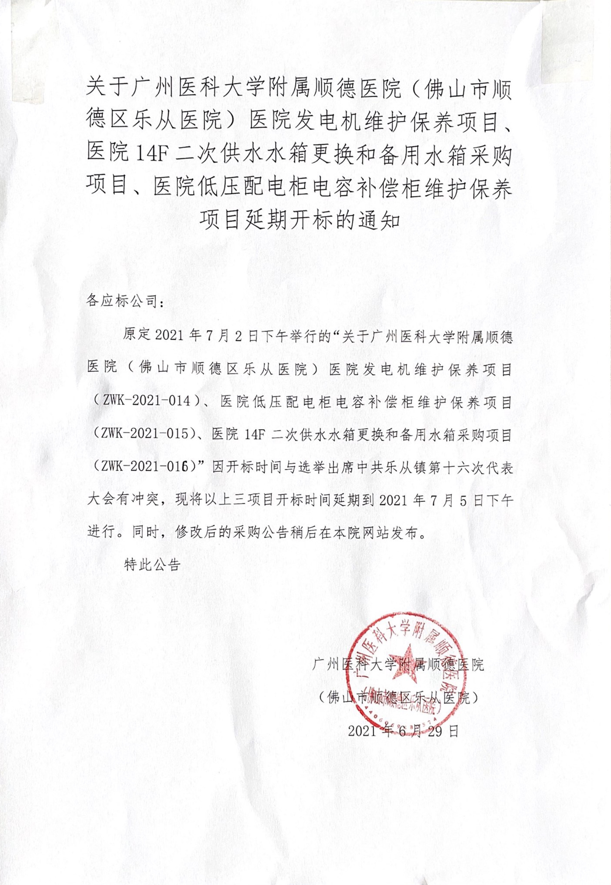 關(guān)于廣州醫(yī)科大學(xué)附屬順德醫(yī)院(佛山市順德區(qū)樂(lè)從醫(yī)院)醫(yī)院發(fā)電機(jī)維護(hù)保養(yǎng)項(xiàng)目、醫(yī)院14F二次供水水箱更換和備用水箱采購(gòu)項(xiàng)目、醫(yī)院低壓配電柜電容補(bǔ)償柜維護(hù)保養(yǎng)項(xiàng)目延期開(kāi)標(biāo)的通知)