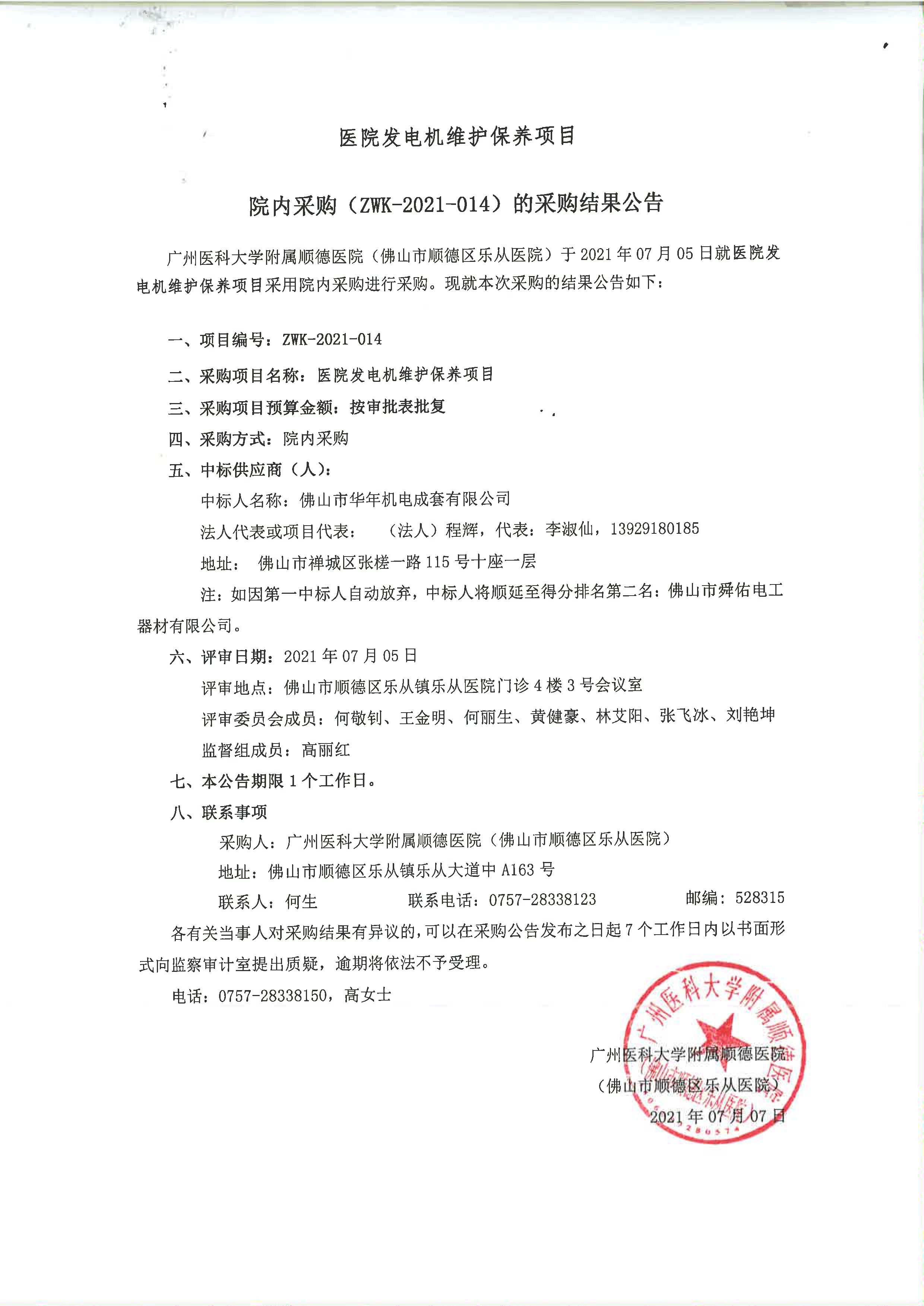 醫(yī)院發(fā)電機(jī)維護(hù)保養(yǎng)項(xiàng)目院內(nèi)采購(ZWK-2021-014)的采購結(jié)果公告)