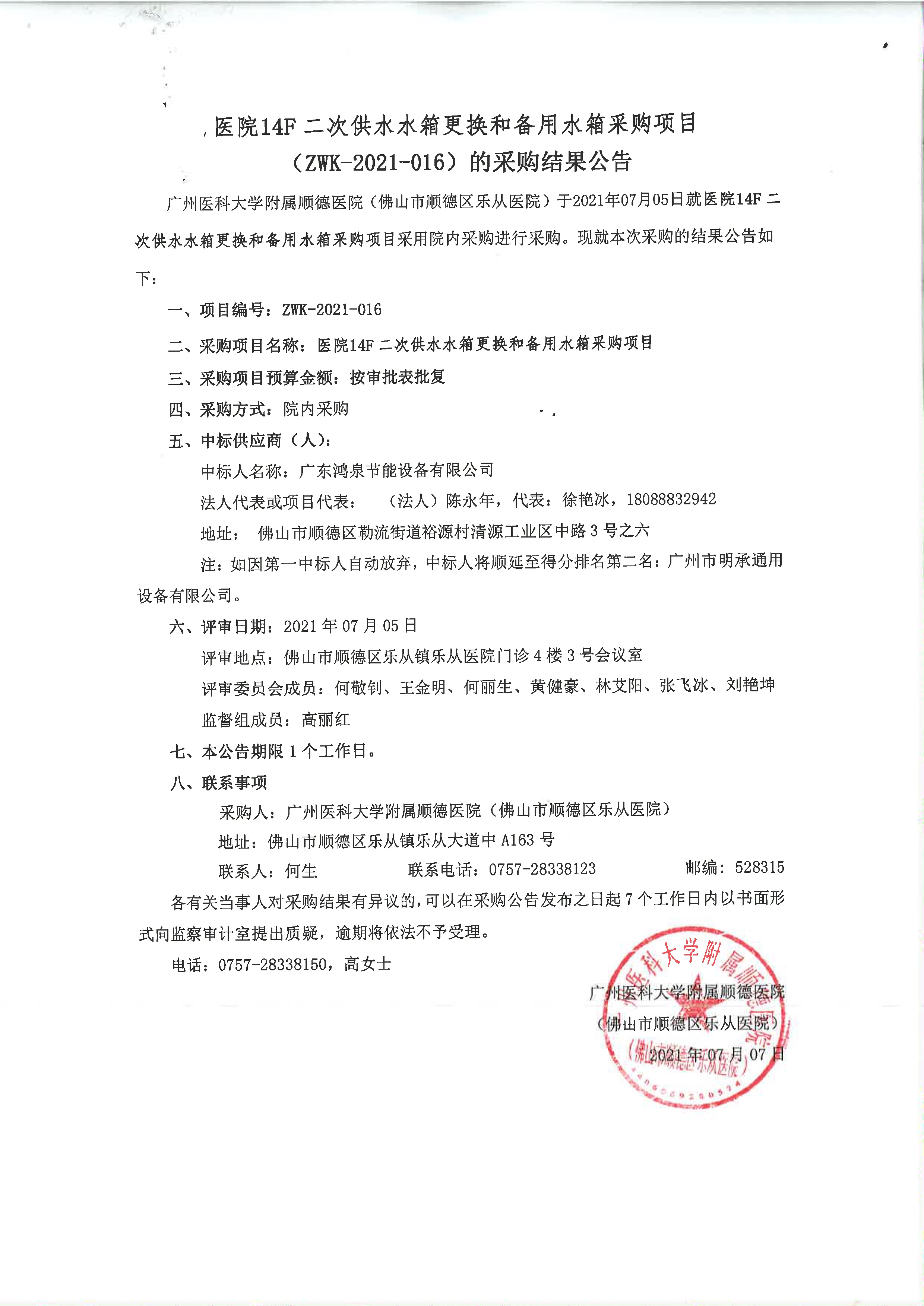 醫(yī)院14F二次供水水箱更換和備用水箱采購項(xiàng)目(ZWK-2021-016)采購結(jié)果公告