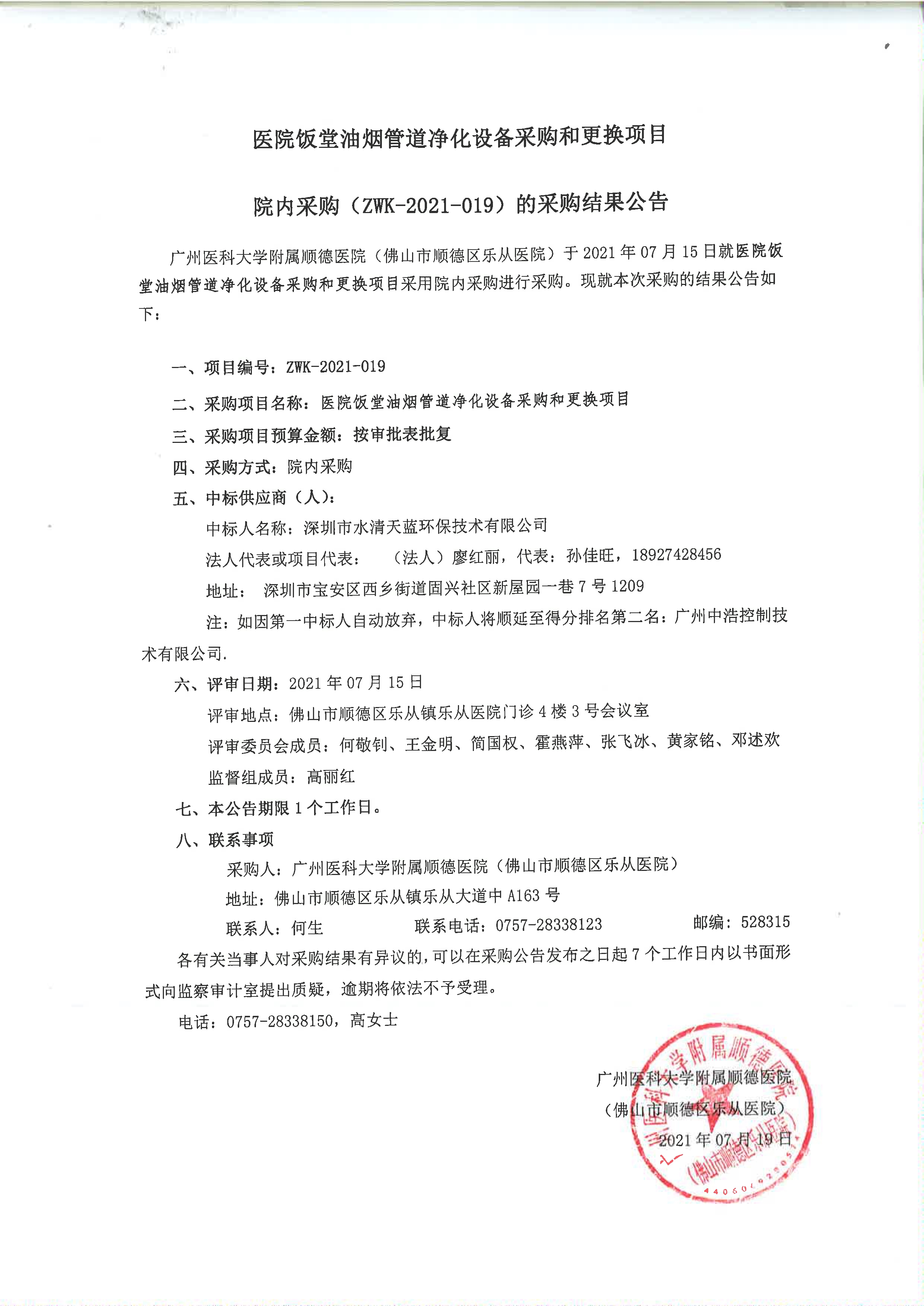 醫(yī)院飯?zhí)糜蜔煿艿纼艋O(shè)備采購(gòu)和更換項(xiàng)目院內(nèi)采購(gòu)(ZWK-2021-019)的采購(gòu)結(jié)果公告