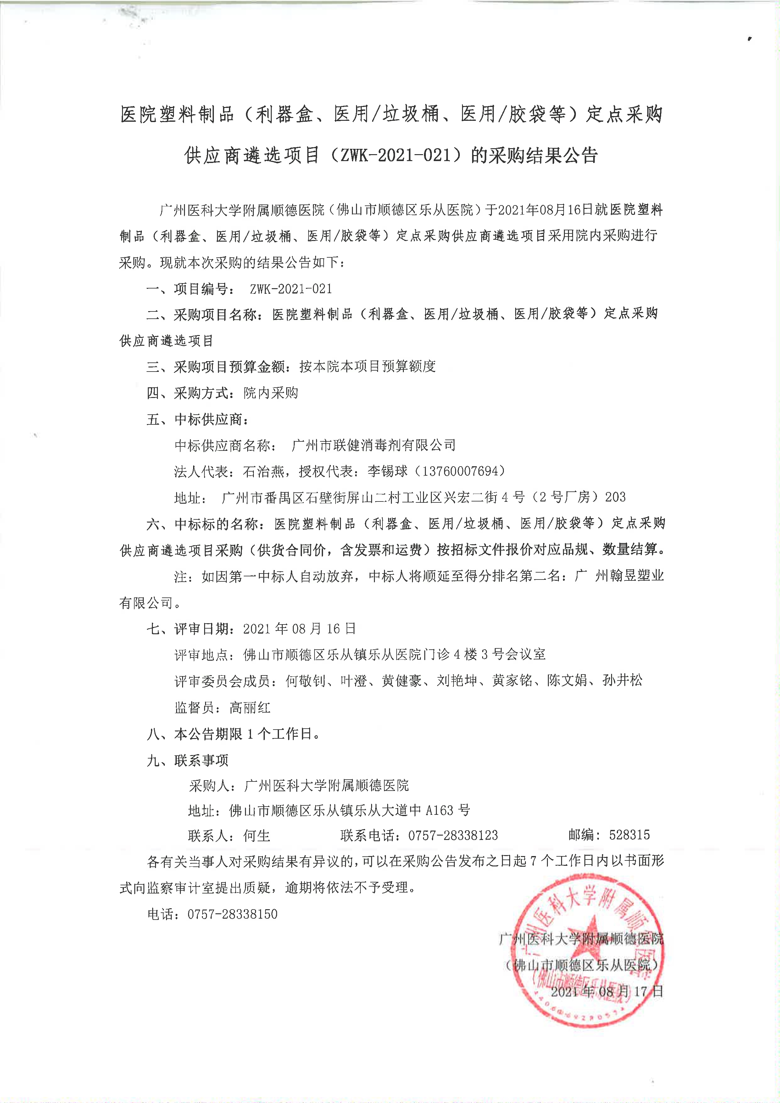醫(yī)院塑料制品(利器盒、醫(yī)用/垃圾袋、醫(yī)用/膠袋等)定點采購供應(yīng)商遴選項目(ZWK-2021-021)的采購結(jié)果公告