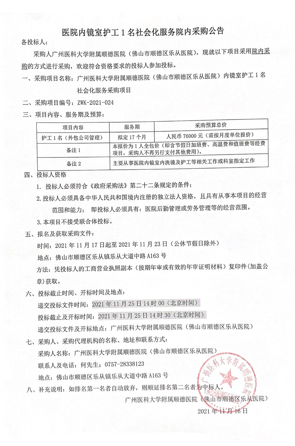 醫(yī)院內(nèi)鏡室護(hù)工1名社會(huì)化服務(wù)院內(nèi)采購(gòu)公告
