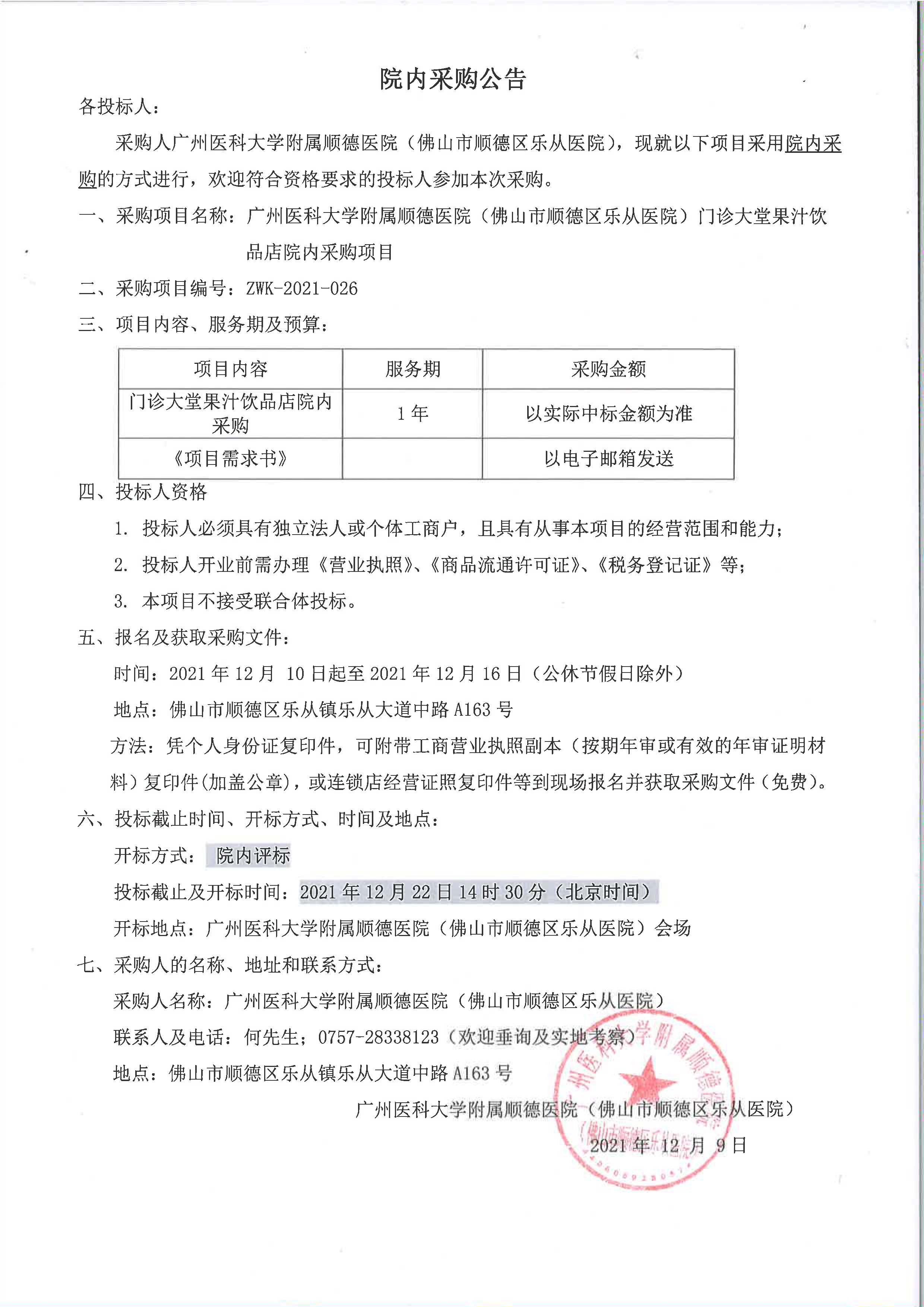門診大堂果汁飲品店院內(nèi)采購項(xiàng)目公告