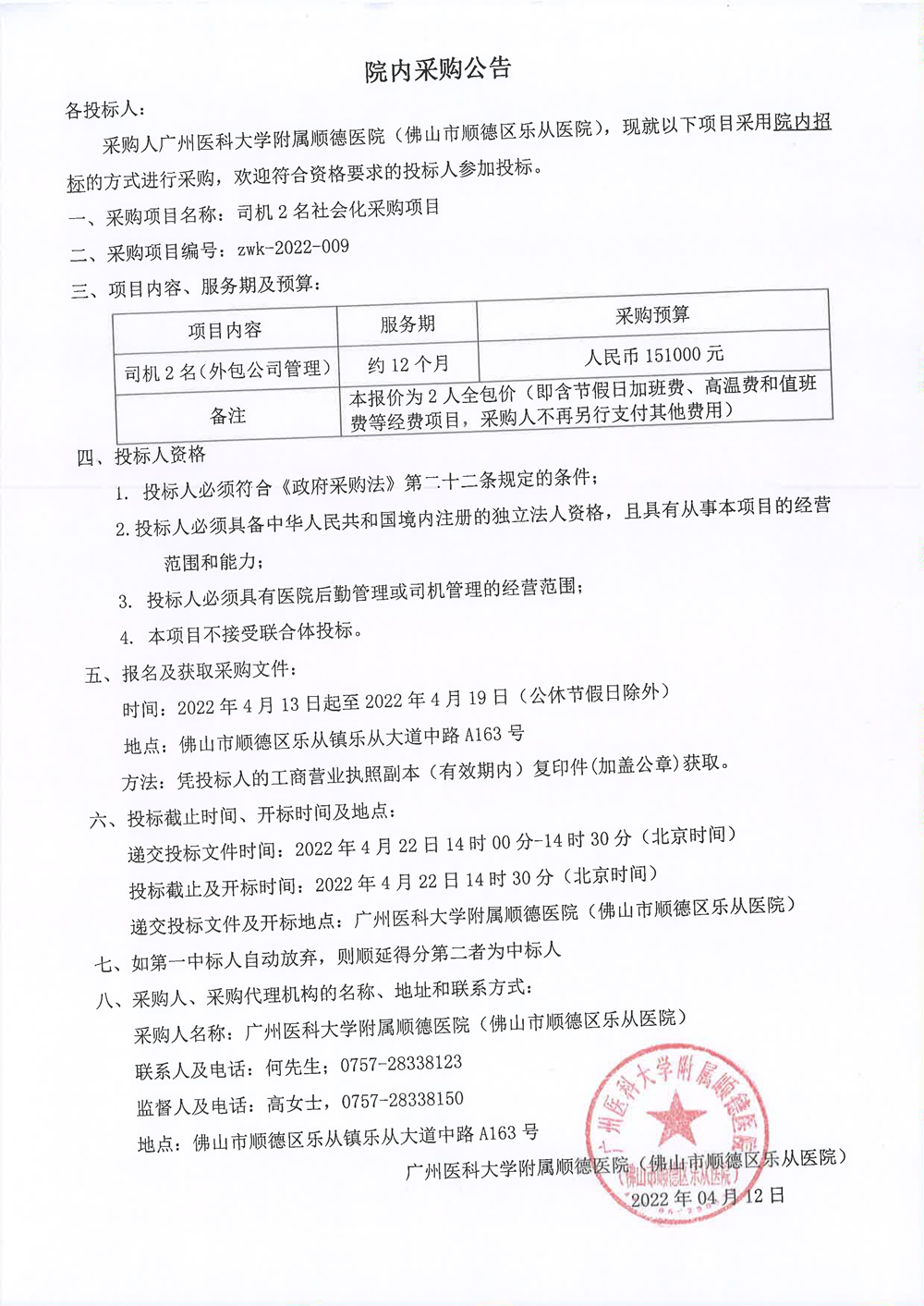 醫(yī)院司機(jī)2名社會(huì)化項(xiàng)目院內(nèi)采購公告