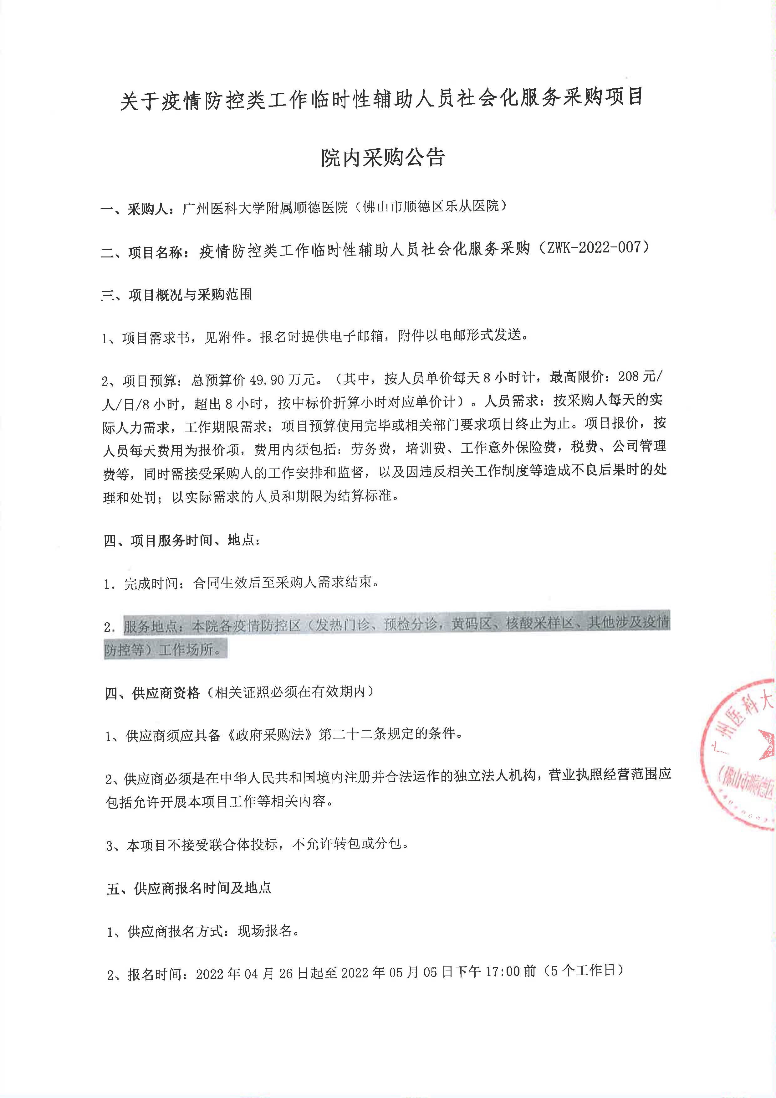 關(guān)于疫情防控類工作臨時(shí)性輔助人員社會化服務(wù)采購項(xiàng)目院內(nèi)采購公告