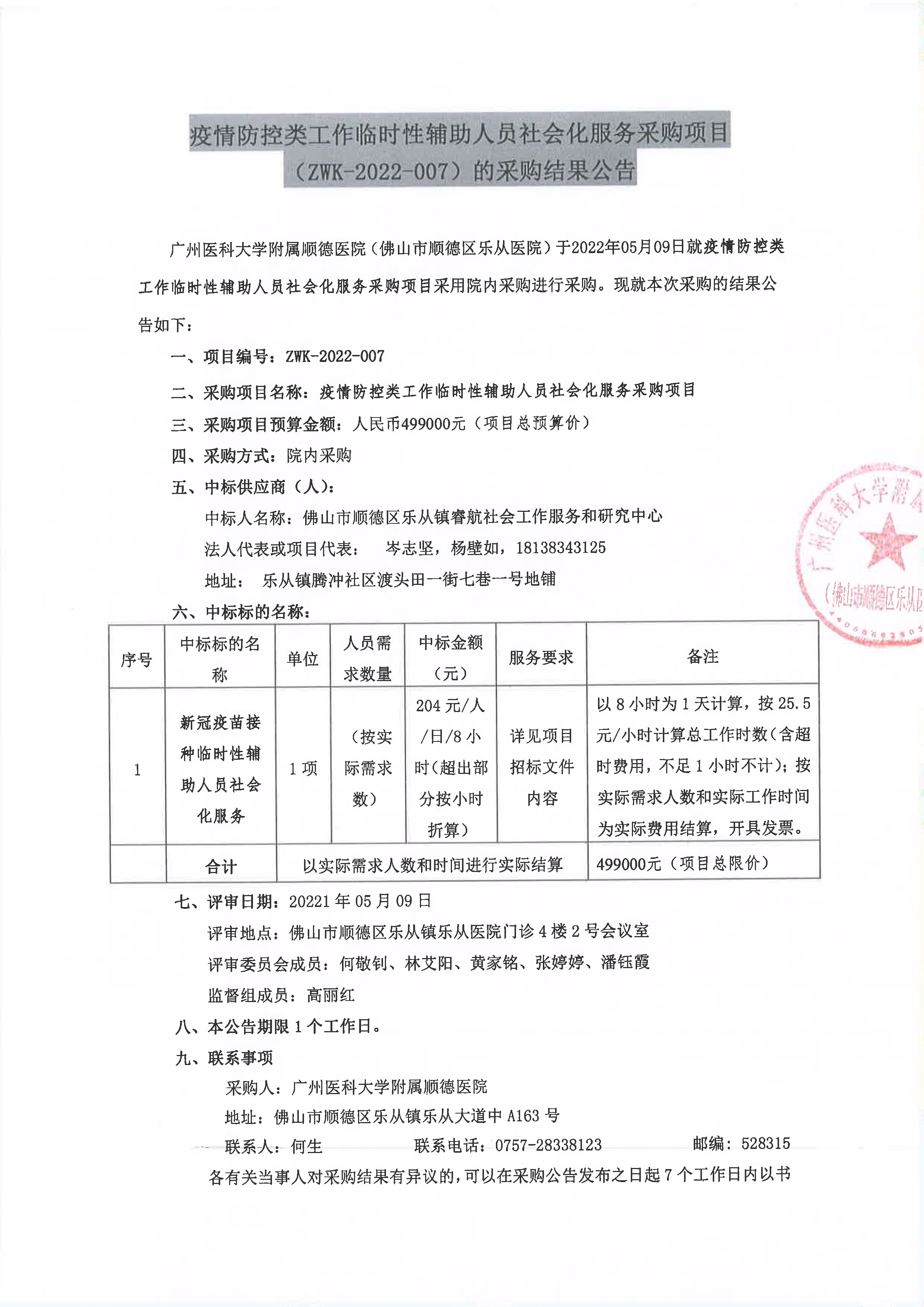 疫情防控類工作臨時性輔助人員社會化服務(wù)采購項目(ZWK-2022-007)的采購結(jié)果公告