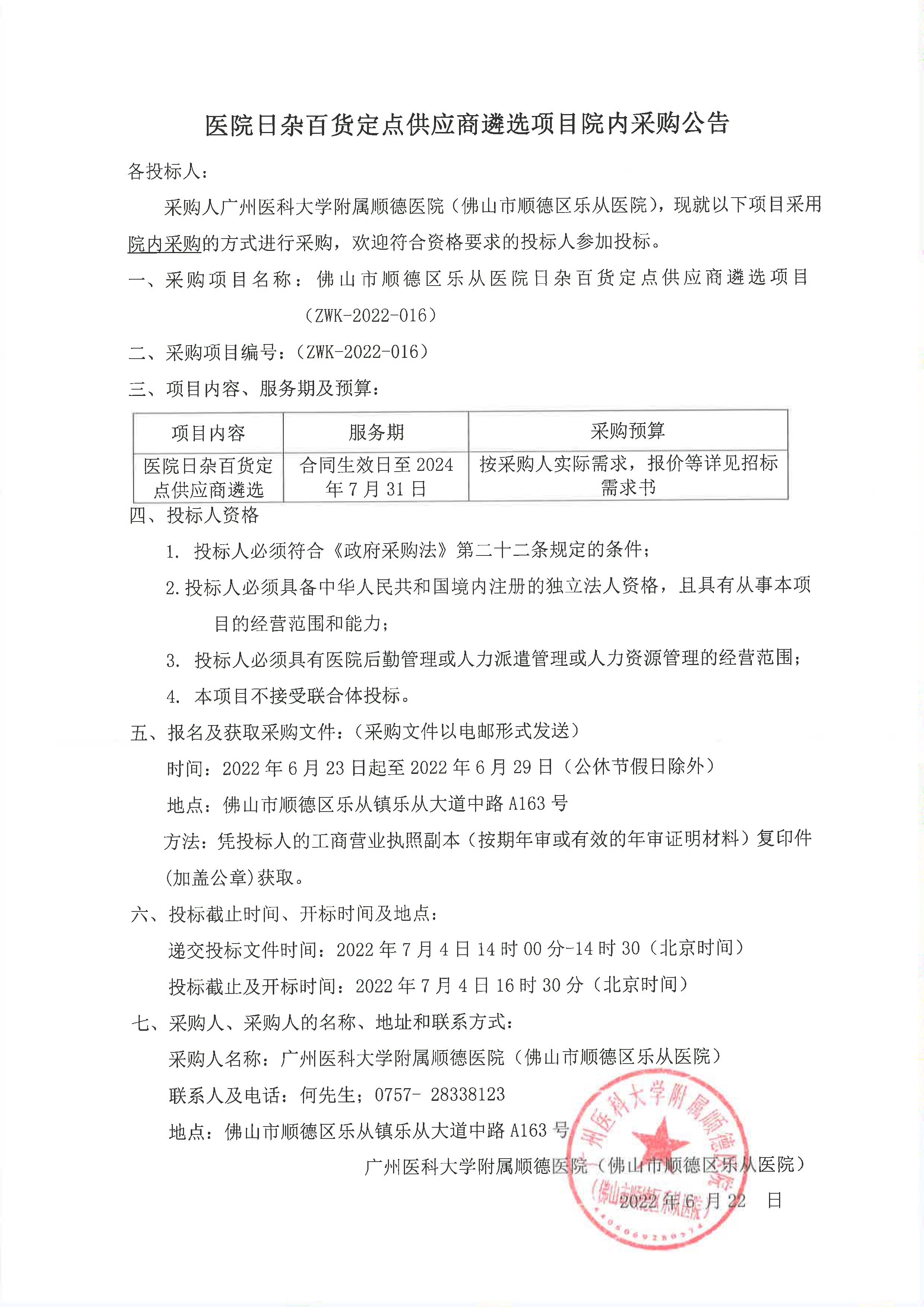 醫(yī)院日雜百貨定點供應(yīng)商遴選項目院內(nèi)采購公告