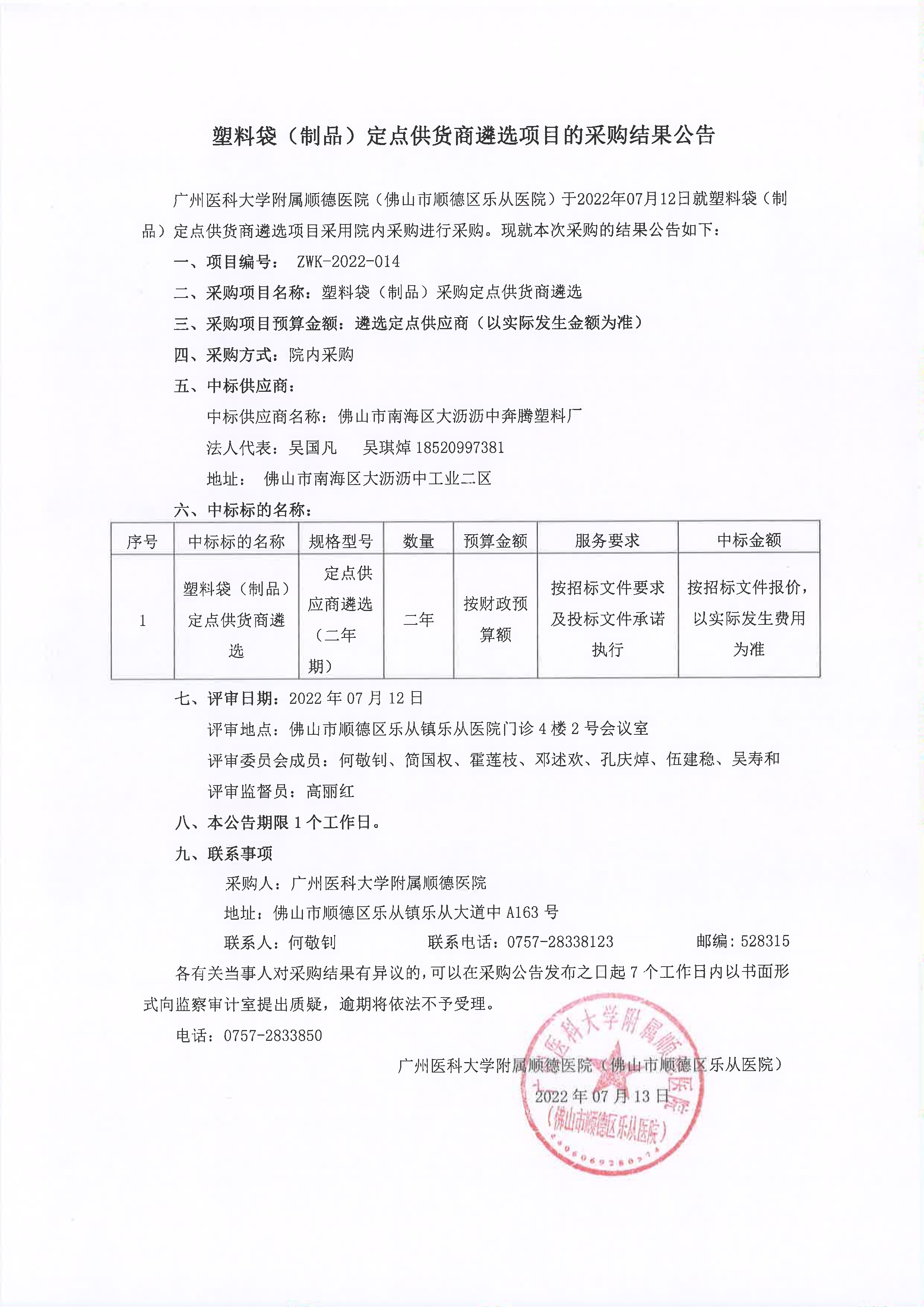 塑料袋(制品)定點(diǎn)供貨商遴選項(xiàng)目的采購結(jié)果公告