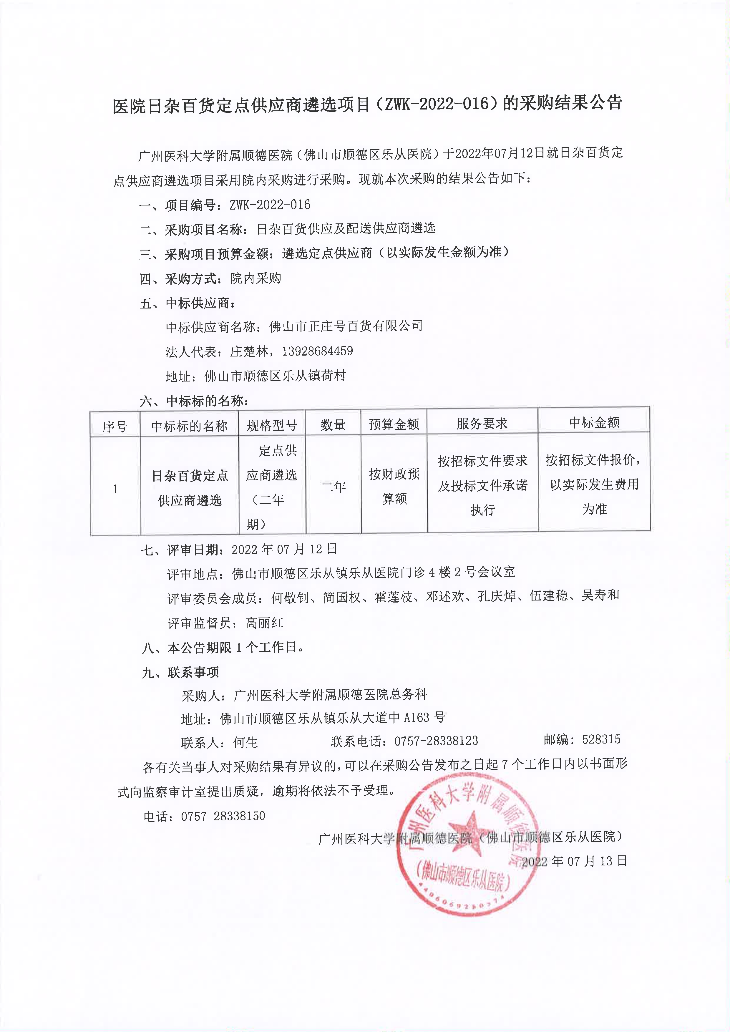 醫(yī)院日雜百貨定點供應(yīng)商遴選項目(ZWK-2022-016)的采購結(jié)果公告