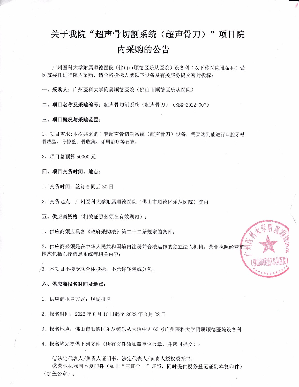 關(guān)于我院“超聲骨切割系統(tǒng)(超聲骨刀)”項(xiàng)目院內(nèi)采購(gòu)的公告