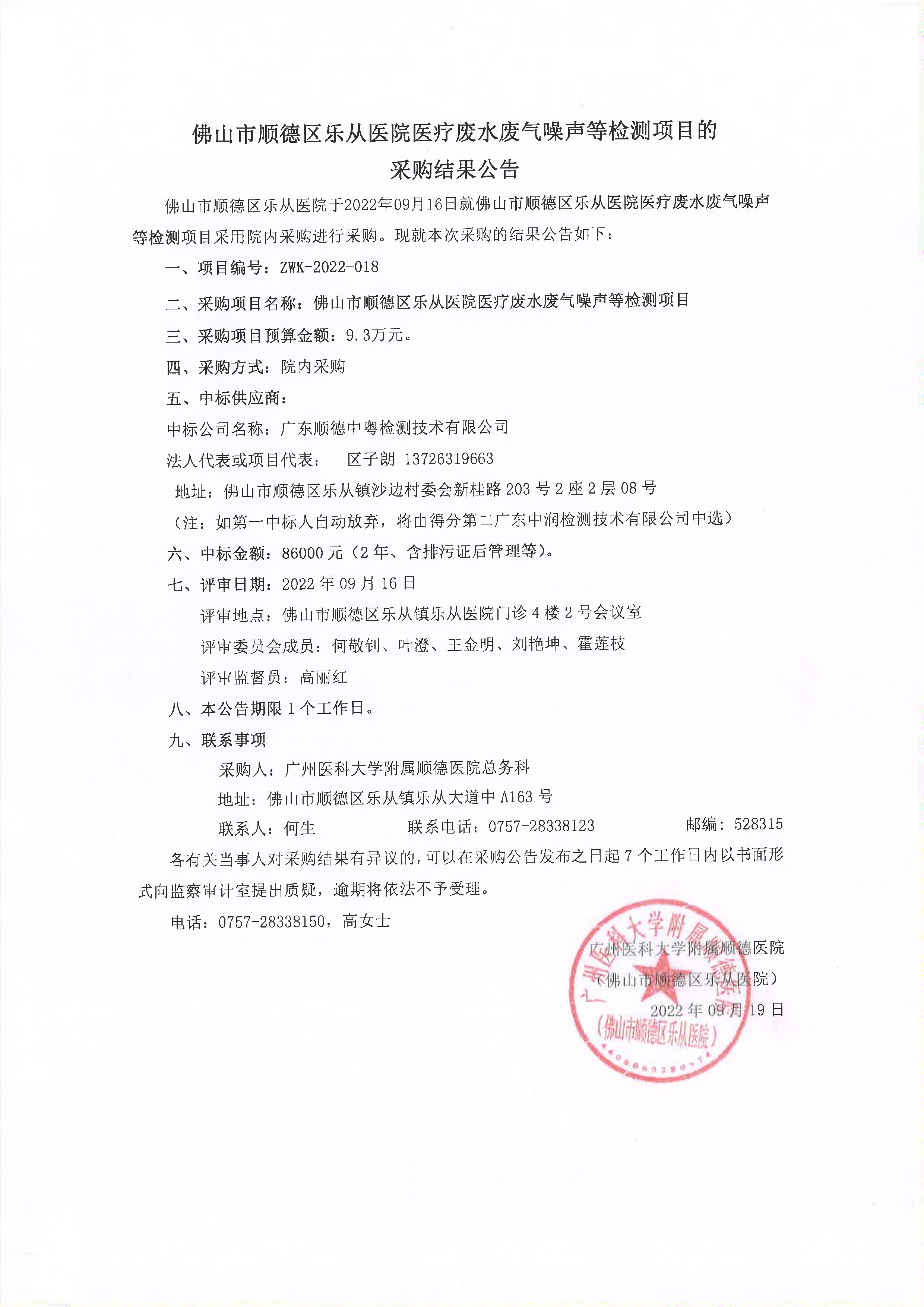 佛山市順德區(qū)樂從醫(yī)院醫(yī)療廢水廢氣噪聲等檢測(cè)項(xiàng)目的采購(gòu)結(jié)果公告