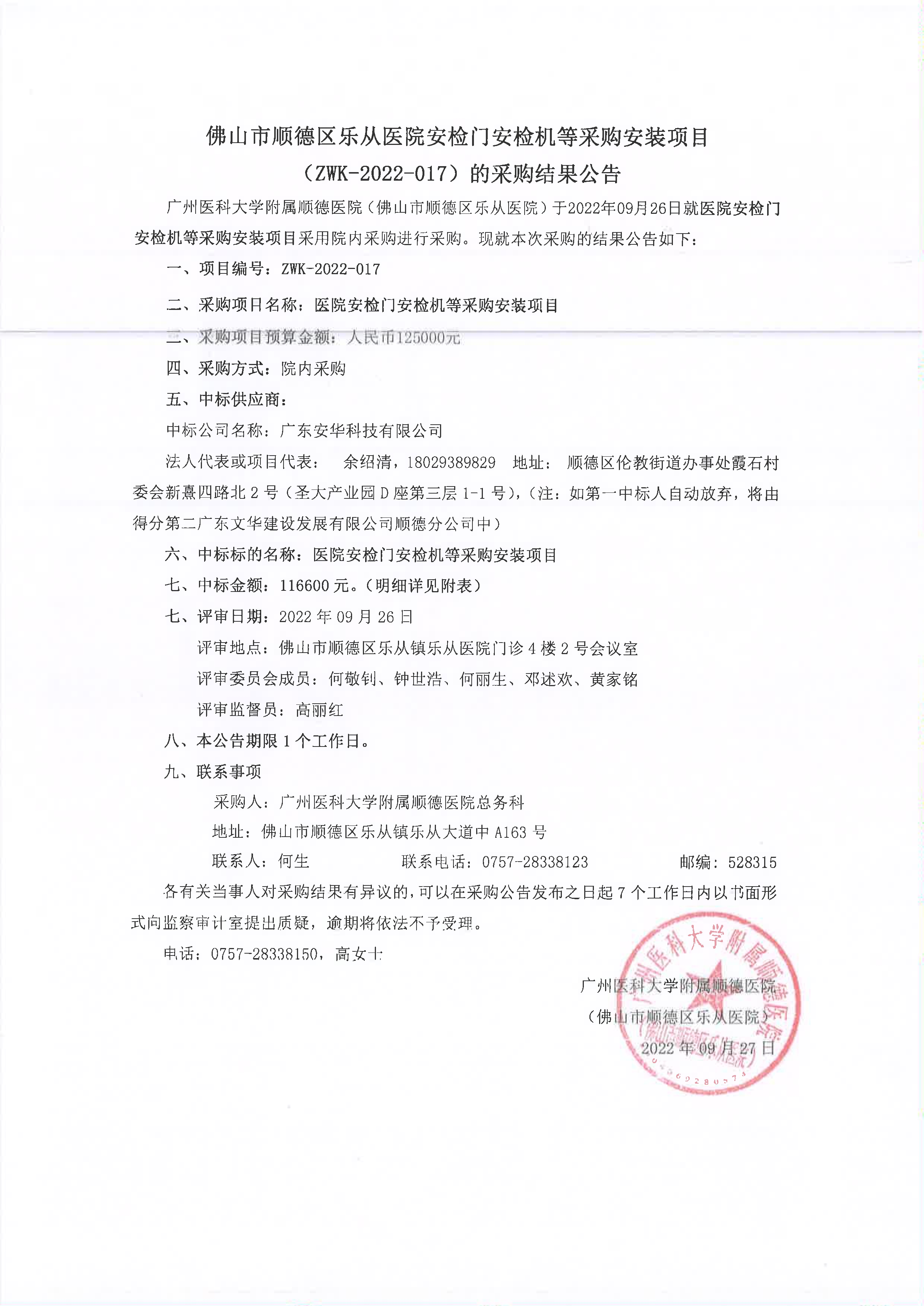 醫(yī)院安檢門安檢機(jī)等采購安裝項(xiàng)目(ZWK-2022-017)的采購結(jié)果公告
