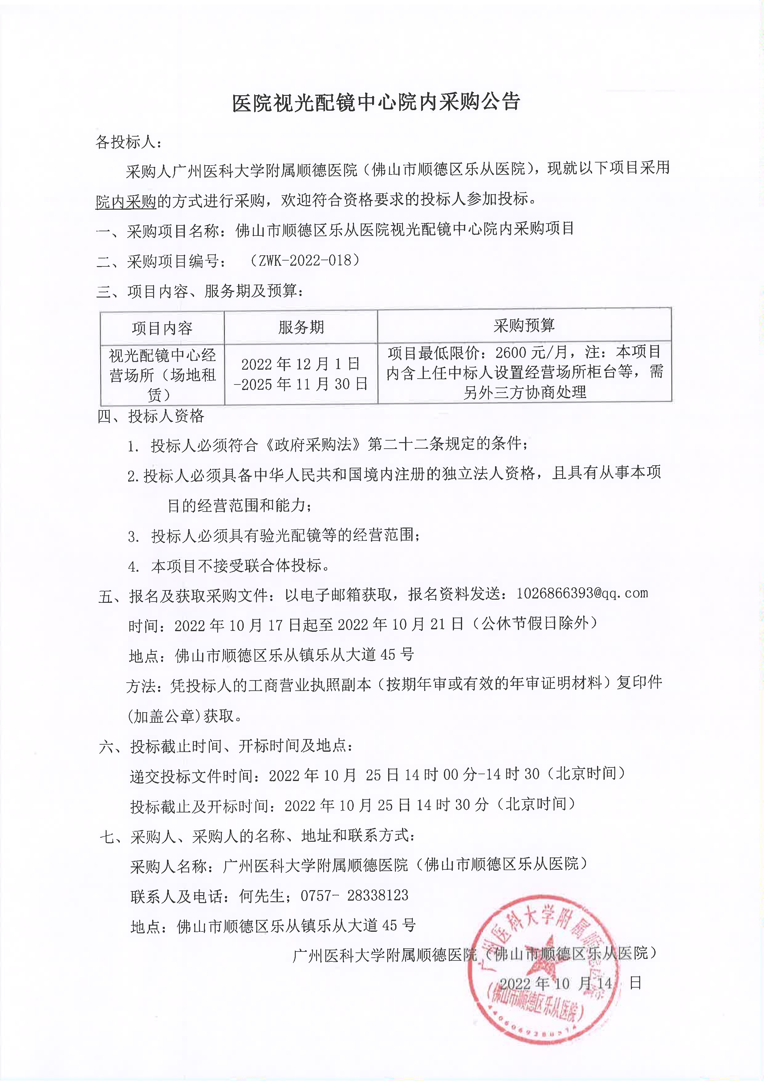 醫(yī)院視光配鏡中心院內(nèi)采購(gòu)公告