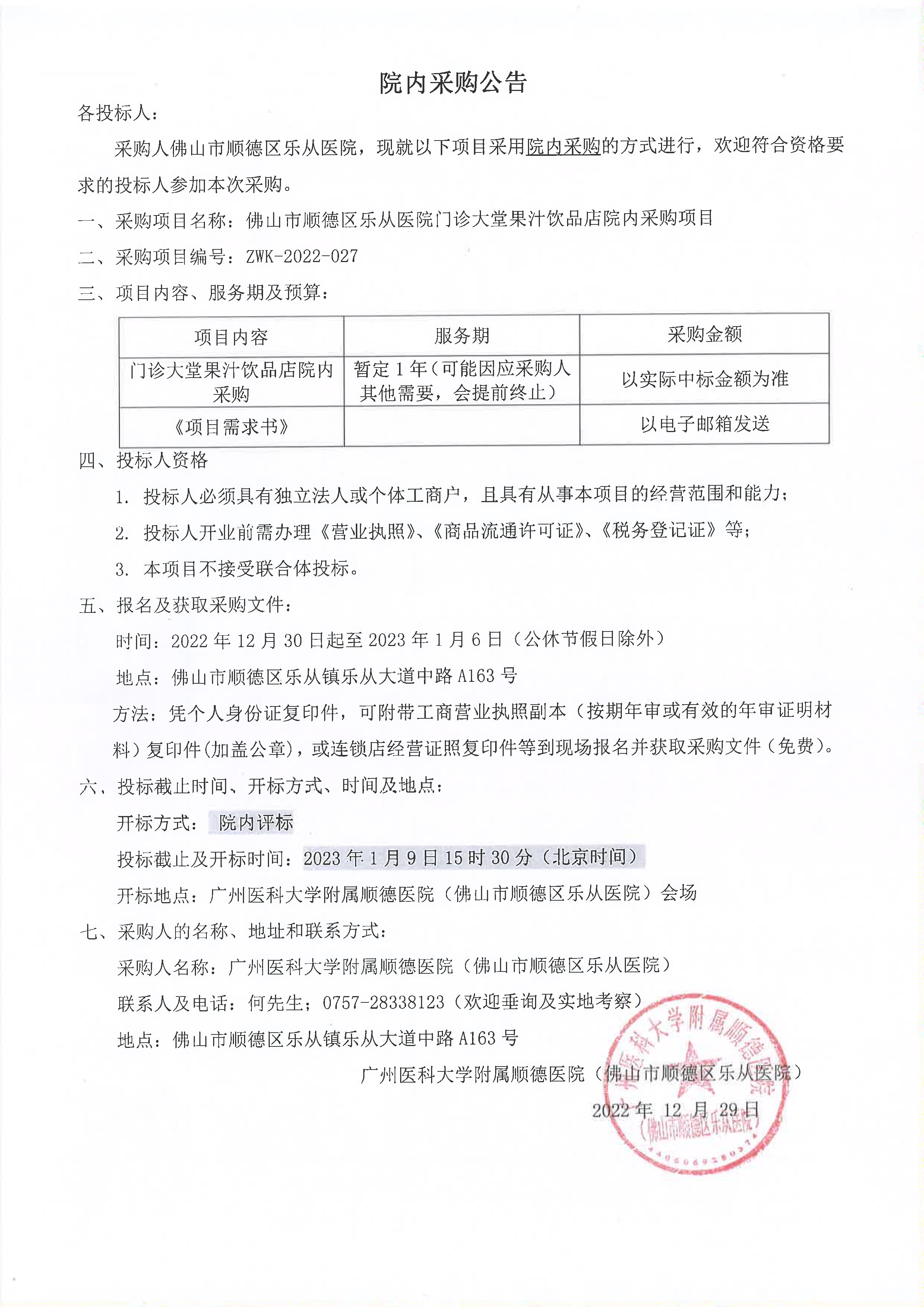 醫(yī)院門診大堂果汁飲品店院內(nèi)采購公告