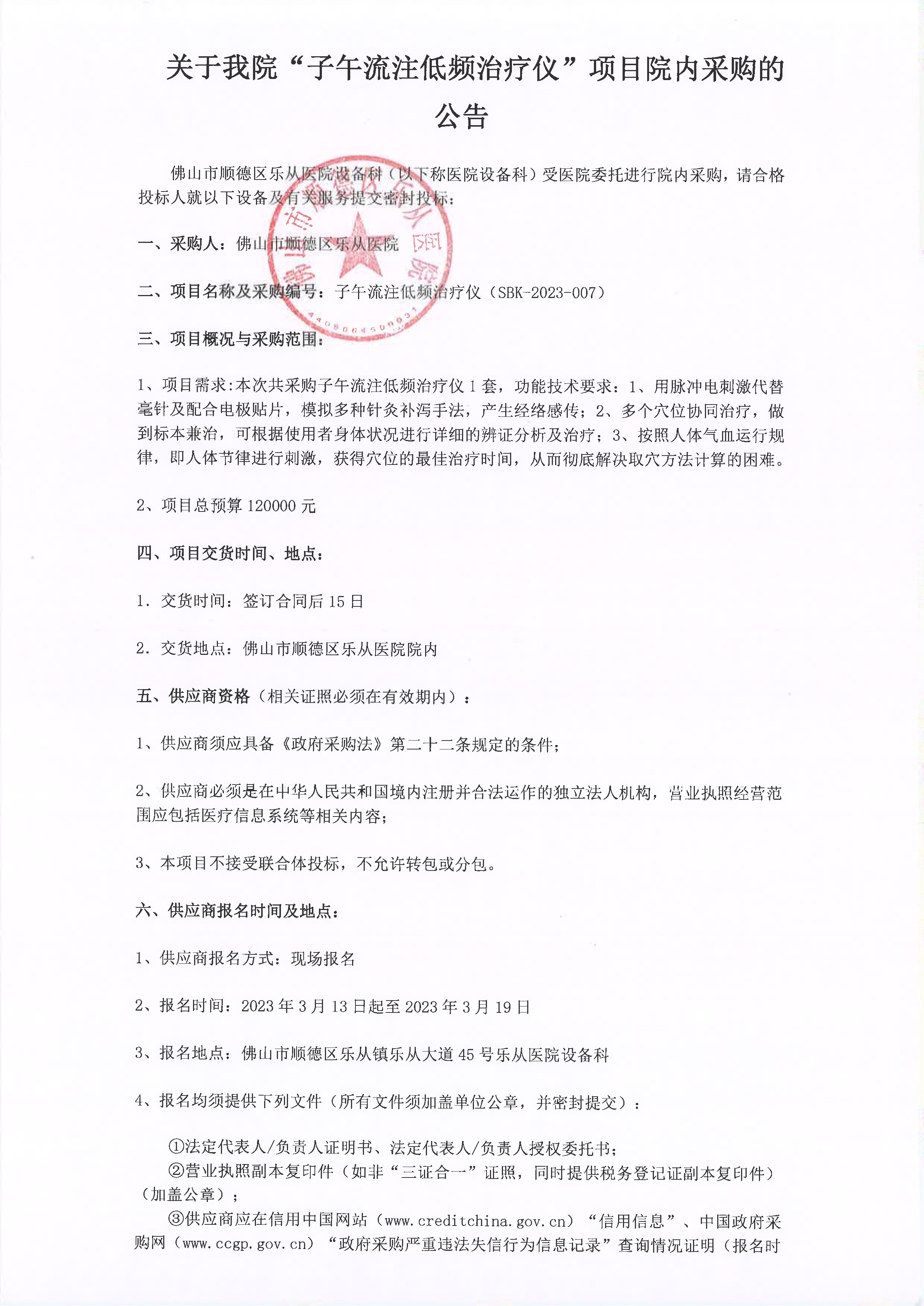 關(guān)于子午流注低頻治療儀項目的院內(nèi)采購公告