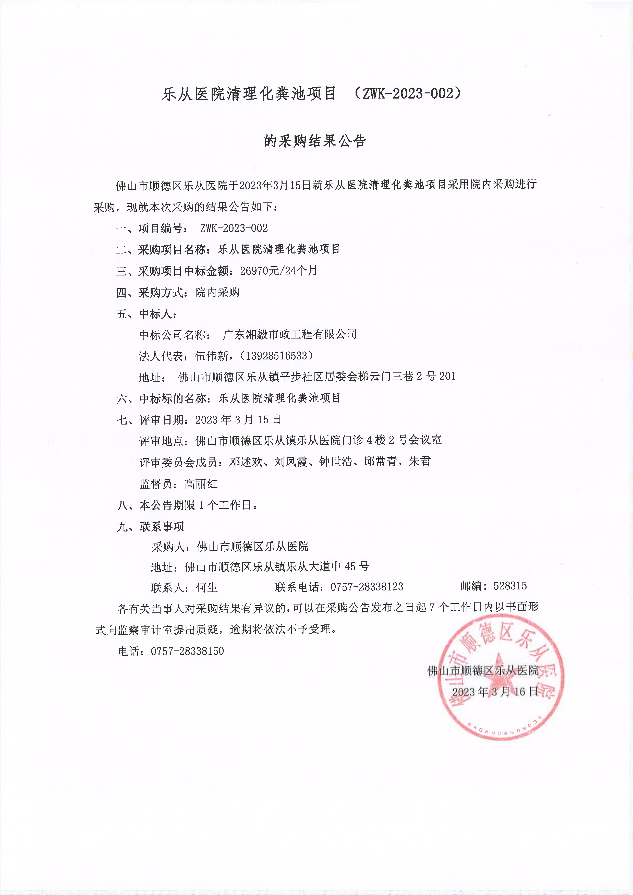 醫(yī)院清理化糞池項目(ZWK-2023-002)的采購結(jié)果公告