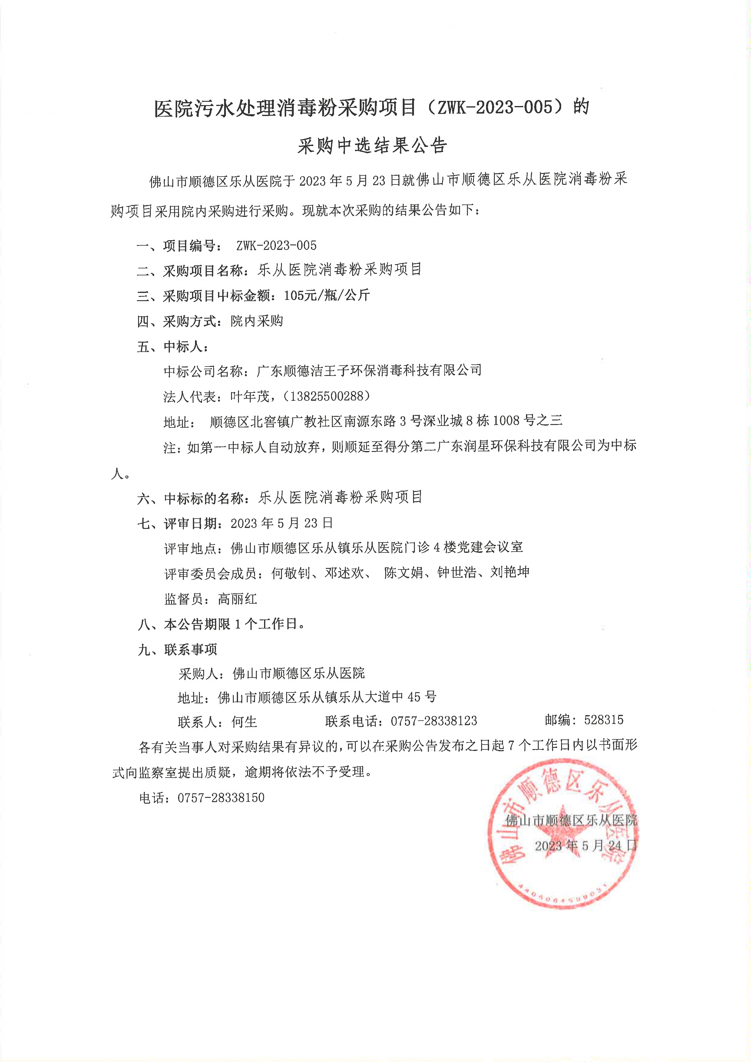 醫(yī)院污水處理消毒粉采購(gòu)項(xiàng)目(ZWK-2023-005)的采購(gòu)中選結(jié)果公告