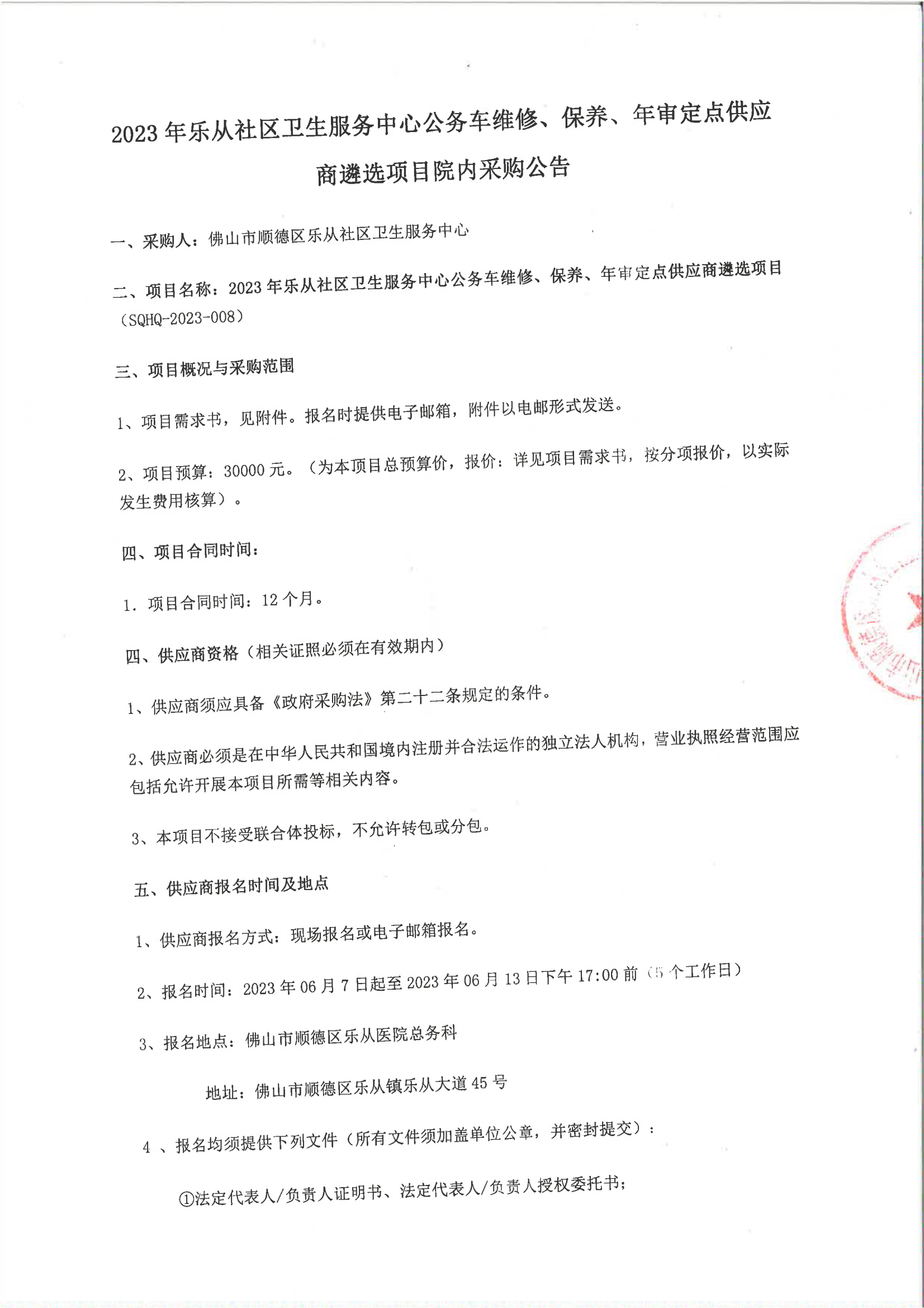 2023年樂從社區(qū)衛(wèi)生服務(wù)中心公務(wù)車維修、保養(yǎng)、年審定點(diǎn)供應(yīng)商遴選項(xiàng)目院內(nèi)采購公告