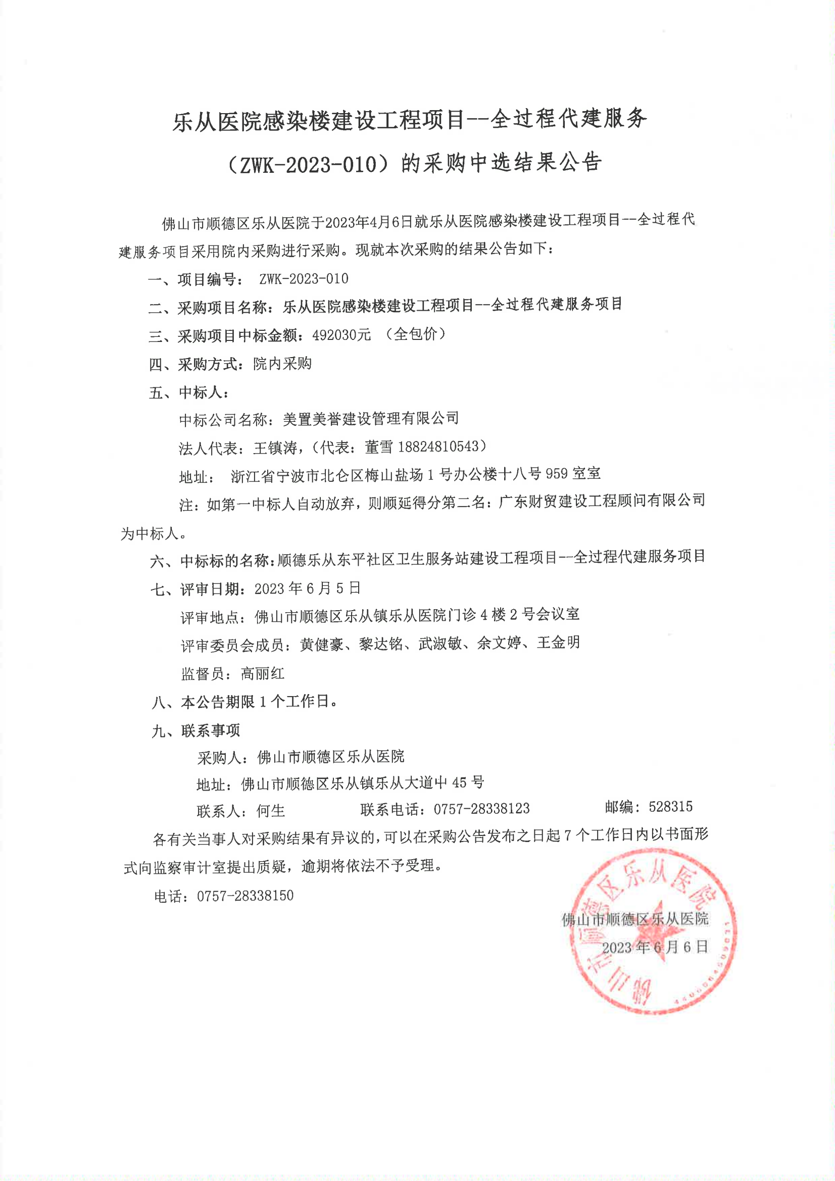 樂(lè)從醫(yī)院感染樓建設(shè)工程項(xiàng)目——全過(guò)程代建服務(wù)(ZWK-2023-010)的采購(gòu)中選結(jié)果公告