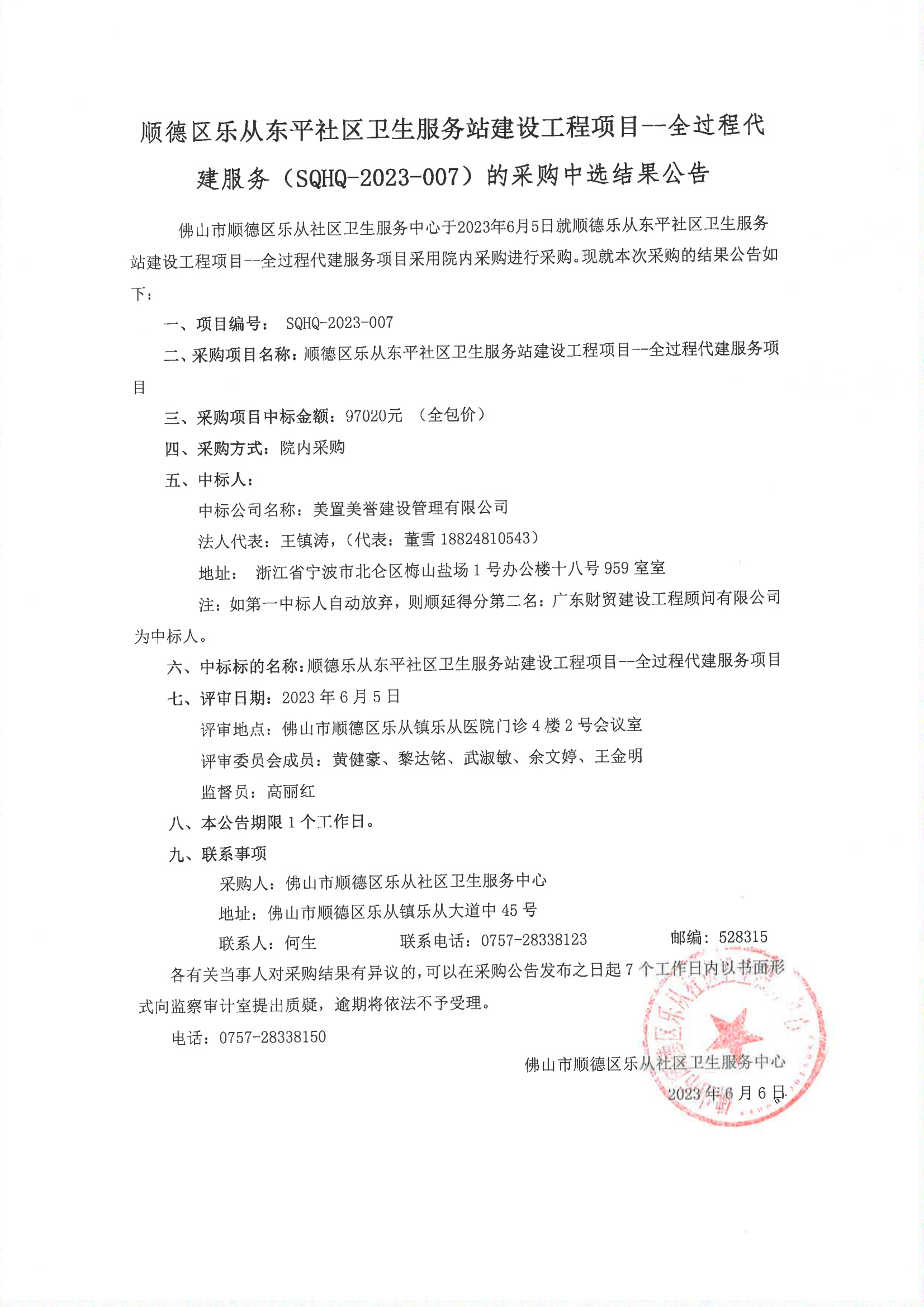 順德區(qū)樂從東平社區(qū)衛(wèi)生服務(wù)站建設(shè)工程項(xiàng)目——全過程代建服務(wù)(SQHQ-2023-007)的采購(gòu)中選結(jié)果公告