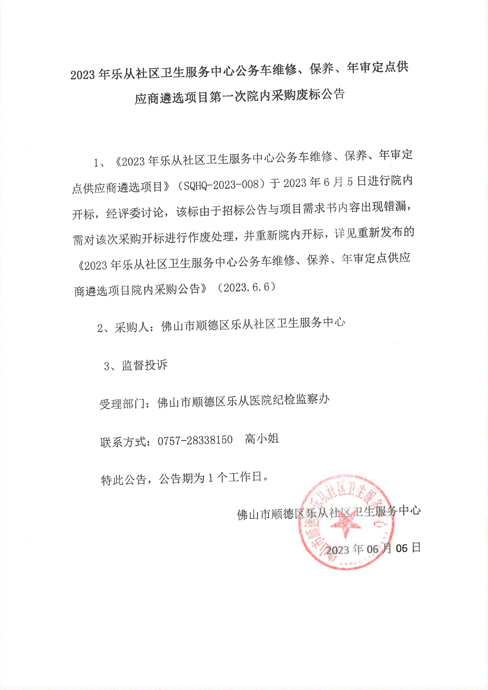 2023年樂從社區(qū)衛(wèi)生服務(wù)中心公務(wù)車維修、保養(yǎng)、年審定點供應(yīng)商遴選項目第一次院內(nèi)采購廢標(biāo)公告