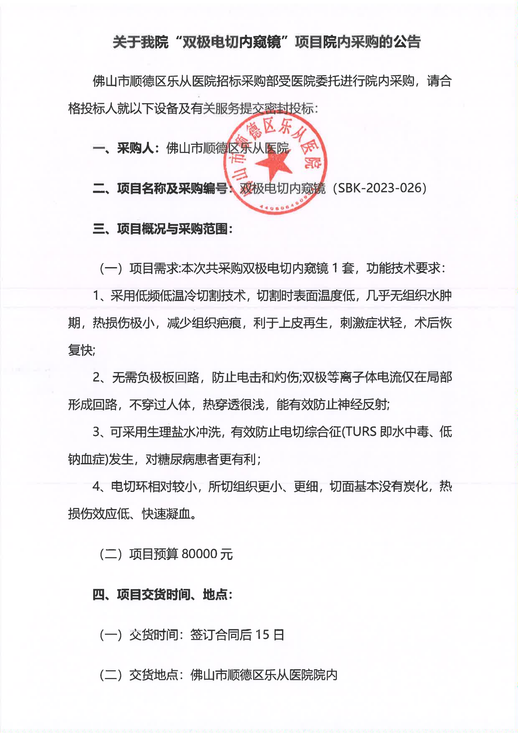 關(guān)于醫(yī)院雙極電切內(nèi)窺鏡項(xiàng)目的院內(nèi)采購(gòu)公告
