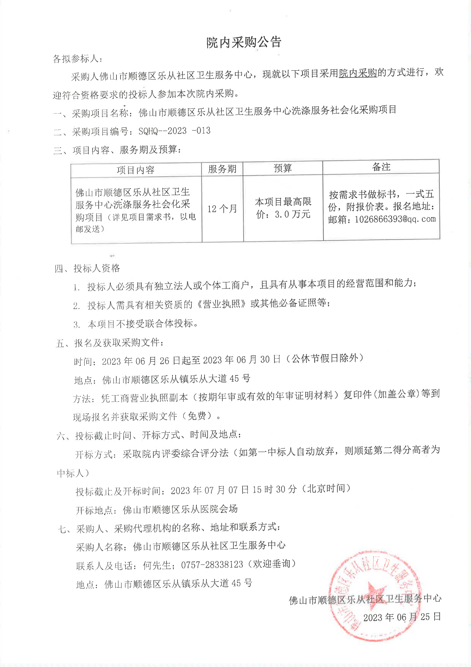 關(guān)于樂從社區(qū)衛(wèi)生服務(wù)中心洗滌服務(wù)項(xiàng)目的院內(nèi)采購公告