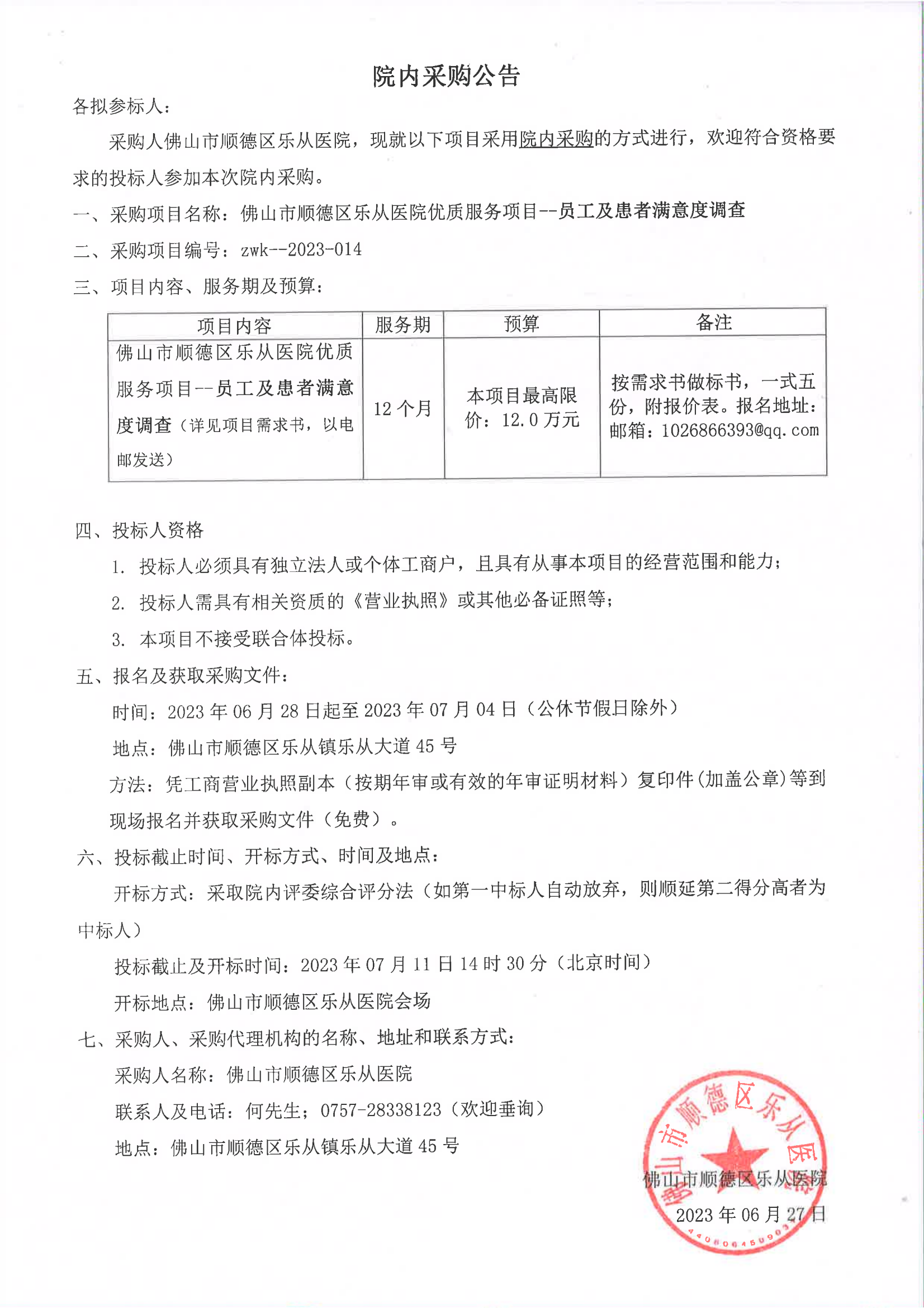 關(guān)于醫(yī)院優(yōu)質(zhì)服務(wù)項(xiàng)目員工及患者滿意度的院內(nèi)采購(gòu)公告