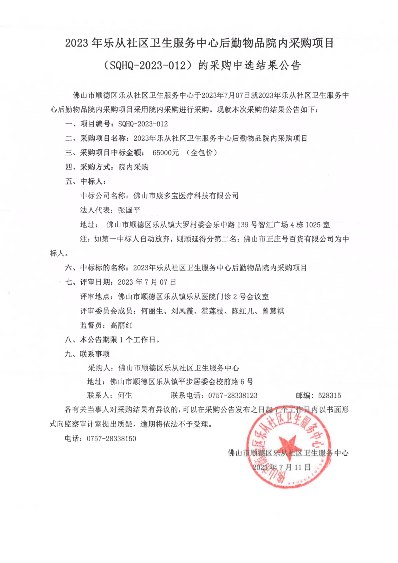 樂從社區(qū)衛(wèi)生服務(wù)中心后勤物品院內(nèi)采購項(xiàng)目(SQHQ-2023-012)的采購中選結(jié)果公告)