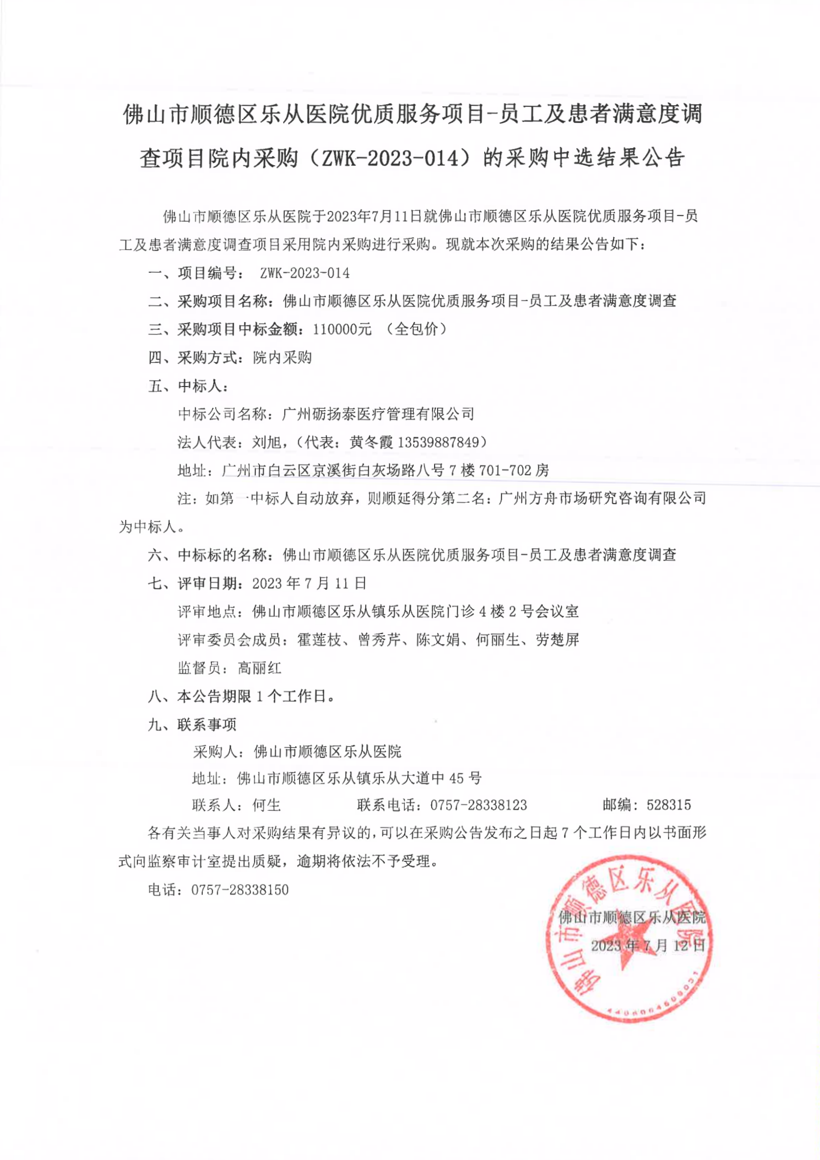 樂從醫(yī)院優(yōu)質服務項目-員工及患者滿意度調查項目院內采購(ZWK-2023-014)的采購中選結果公告