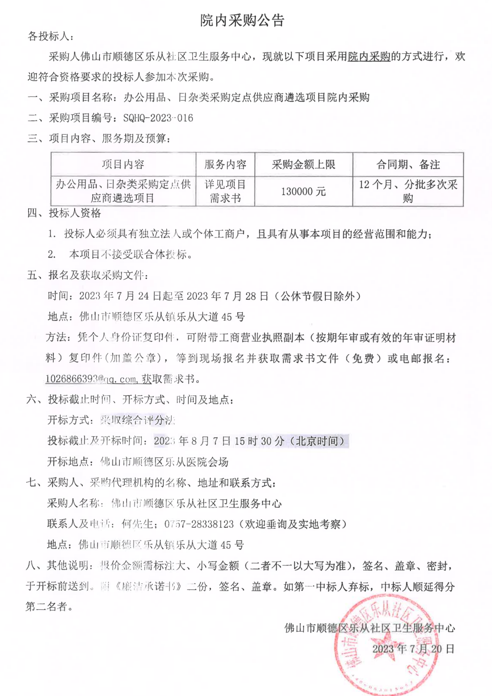 樂(lè)從社區(qū)衛(wèi)生服務(wù)中心辦公用品、日雜類(lèi)采購(gòu)定點(diǎn)供應(yīng)商遴選項(xiàng)目的院內(nèi)采購(gòu)公告