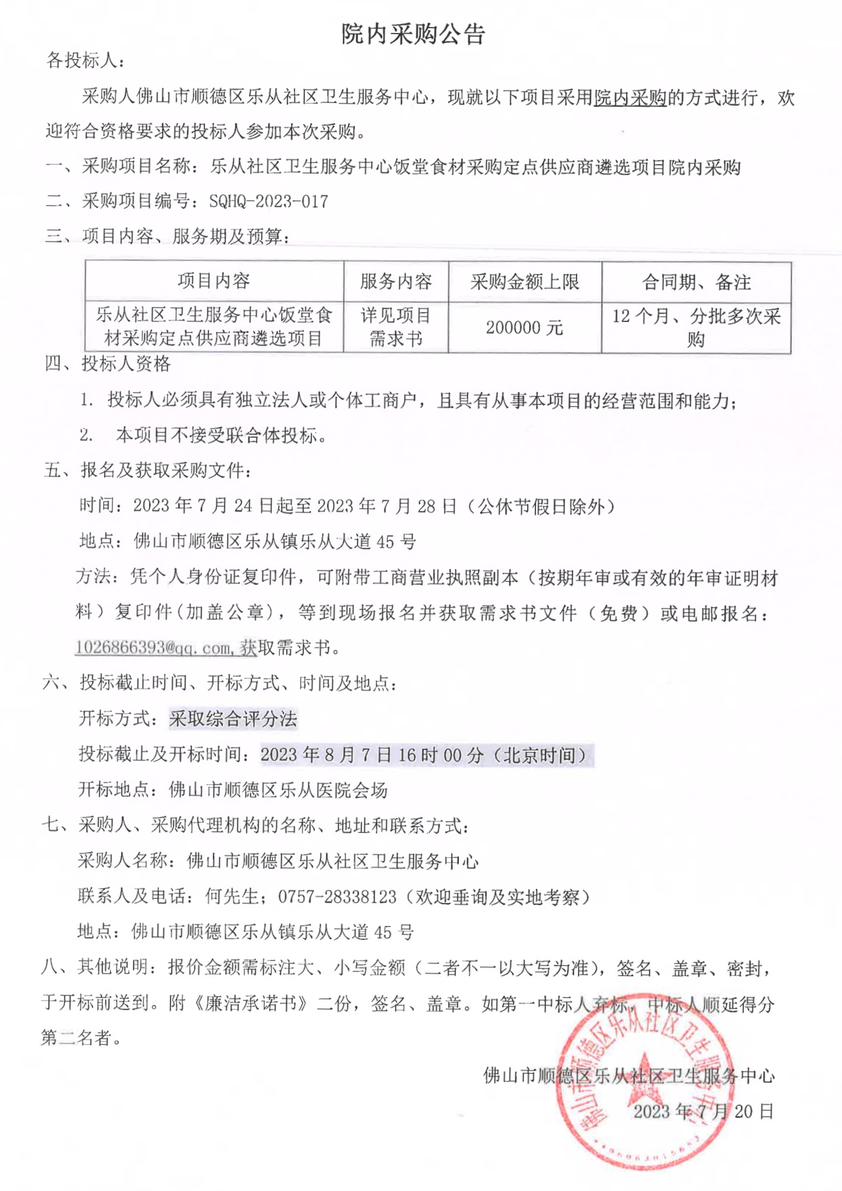 樂從社區(qū)衛(wèi)生服務(wù)中心飯?zhí)檬巢牟少?gòu)定點(diǎn)供應(yīng)商遴選項(xiàng)目的院內(nèi)采購(gòu)公告