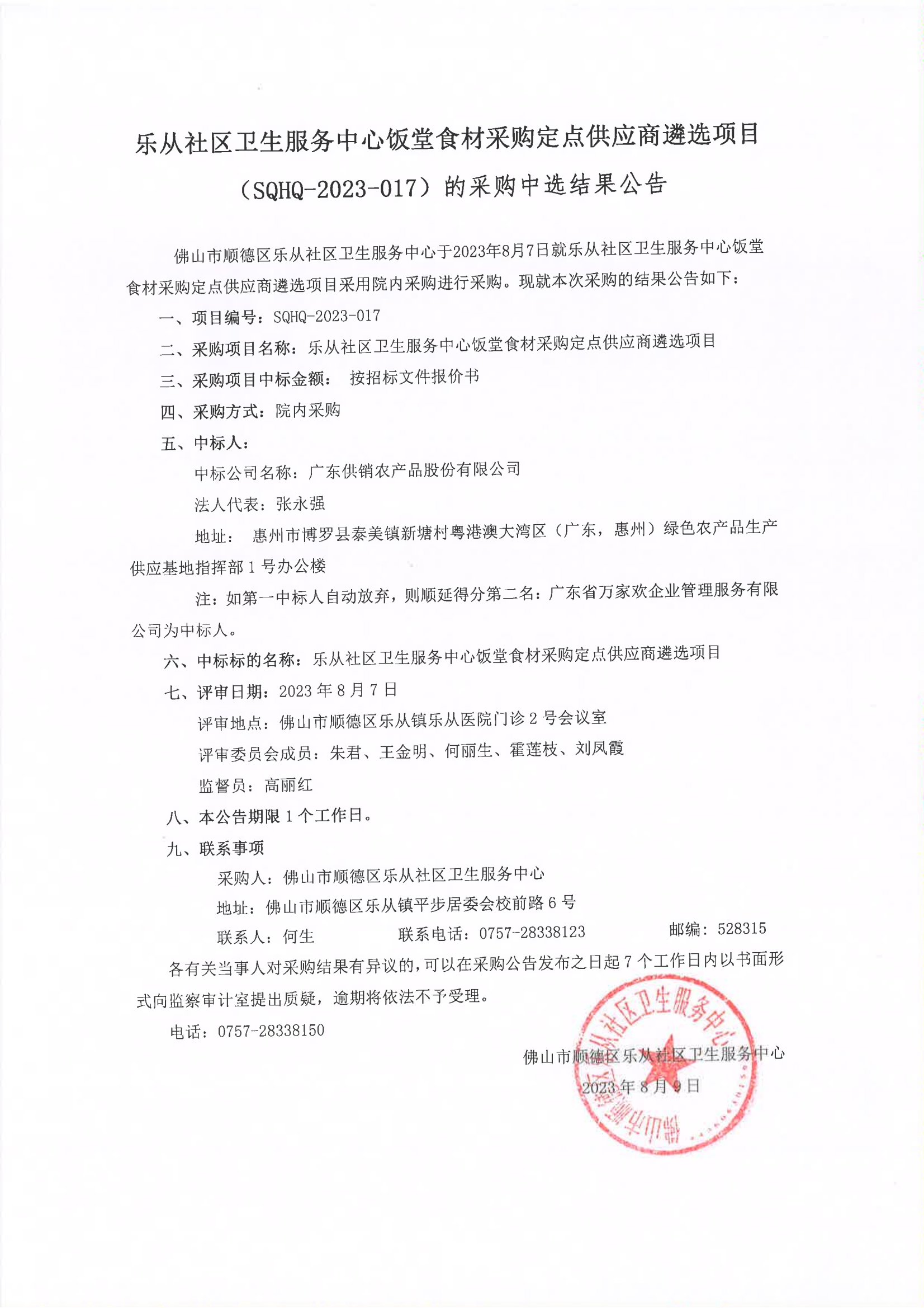 樂從社區(qū)衛(wèi)生服務(wù)中心飯?zhí)檬巢牟少彾c供應商遴選項目(SQHQ-2023-017)的采購中選結(jié)果公告