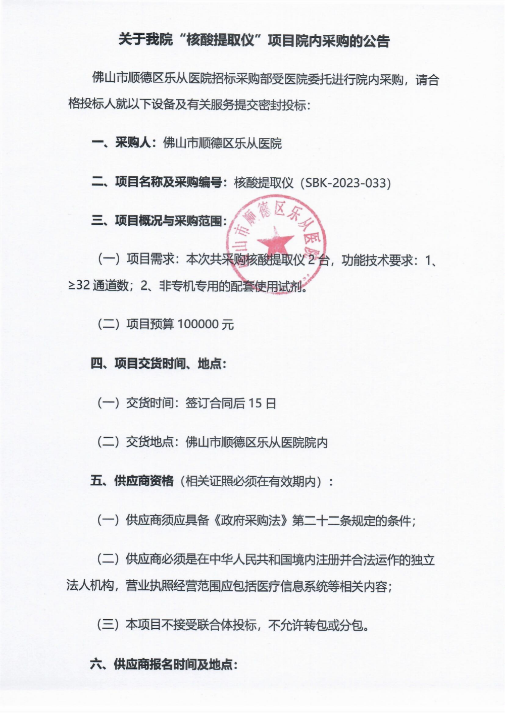 關于樂從醫(yī)院核酸提取儀項目的院內采購公告