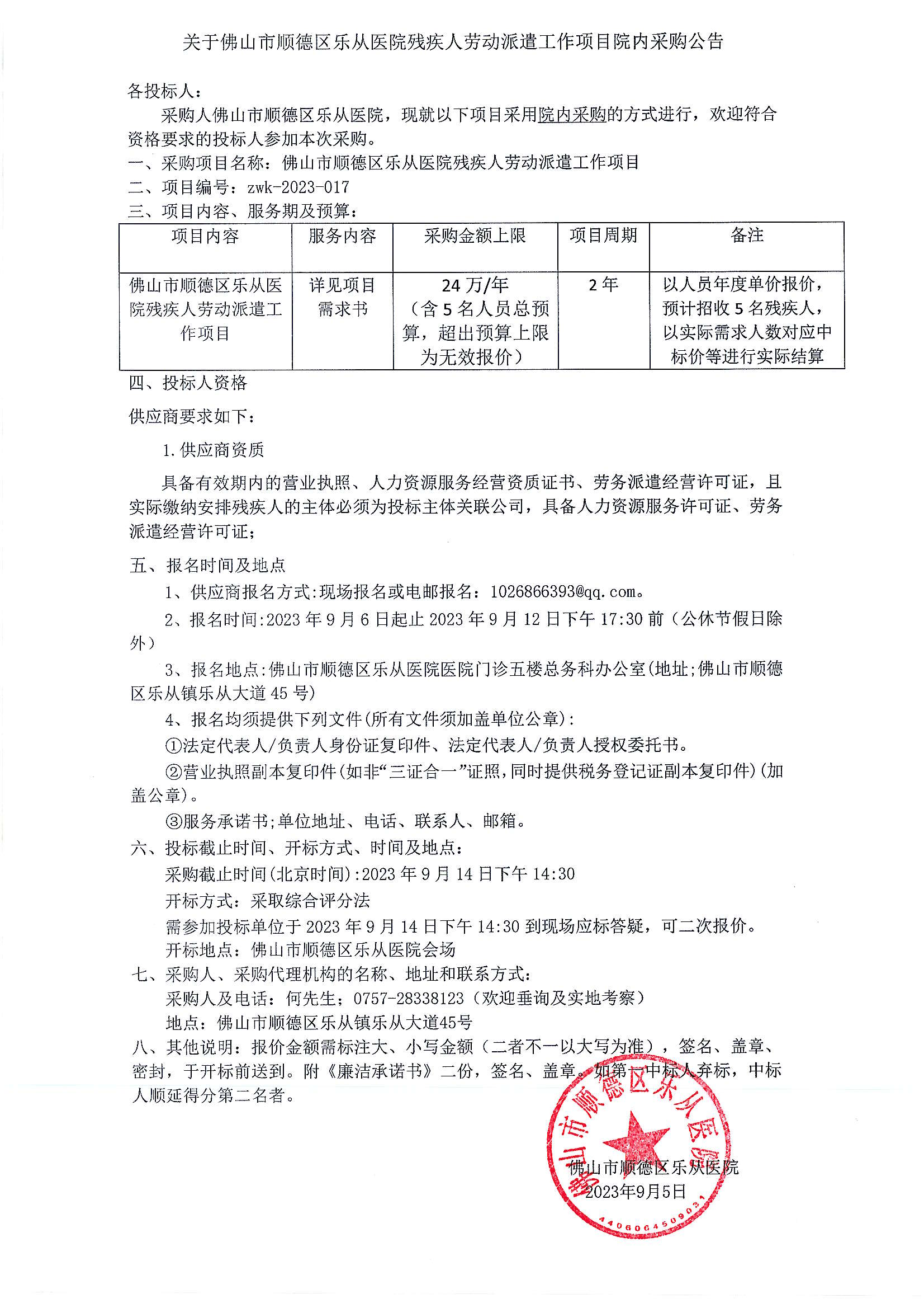 關(guān)于樂(lè)從醫(yī)院殘疾人勞動(dòng)派遣工作項(xiàng)目的院內(nèi)采購(gòu)公告