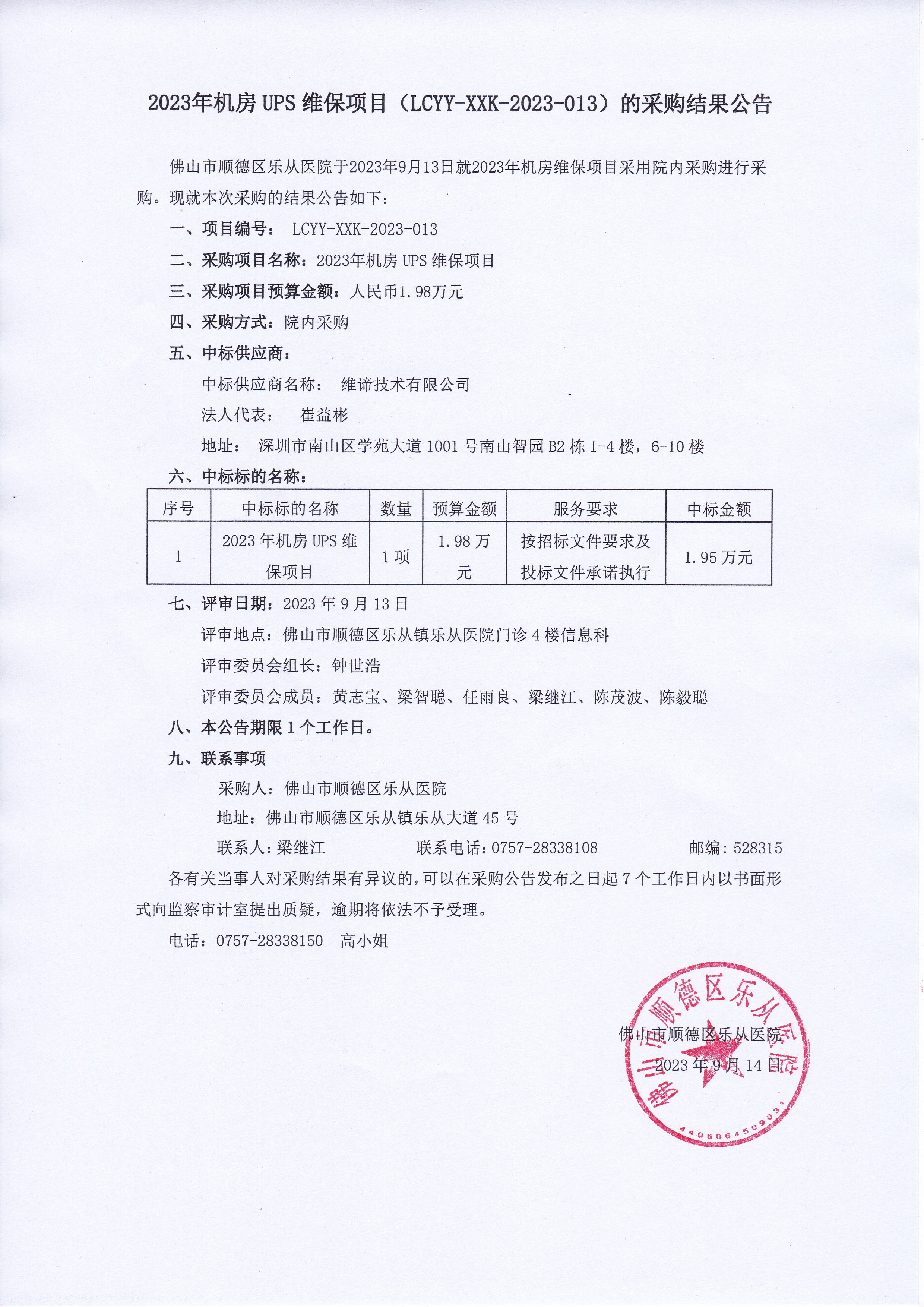 2023年機房UPS維保項目院內(nèi)采購結(jié)果公告