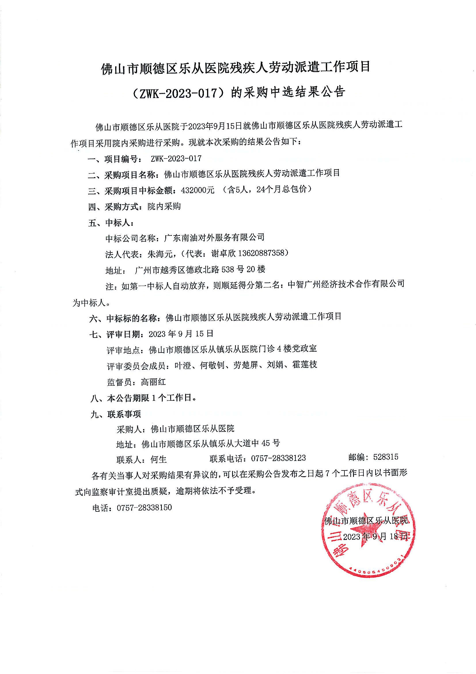 樂從醫(yī)院殘疾人勞動派遣工作項目(ZWK-2023-017)的院內采購結果公告